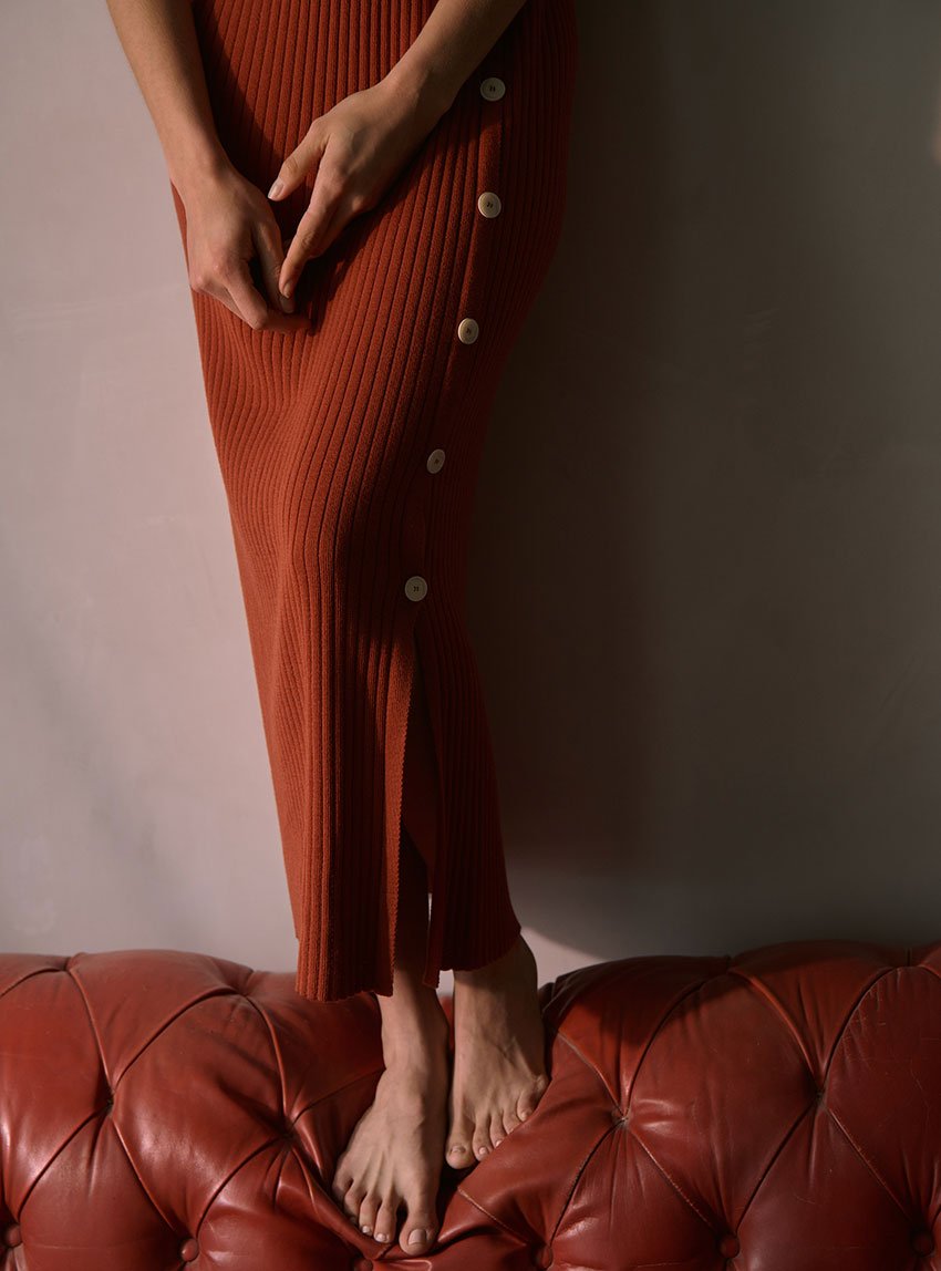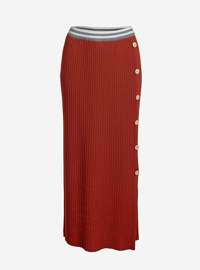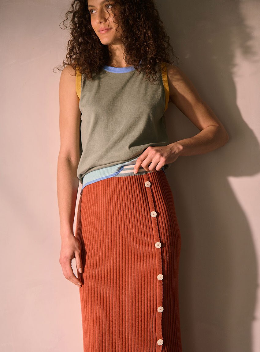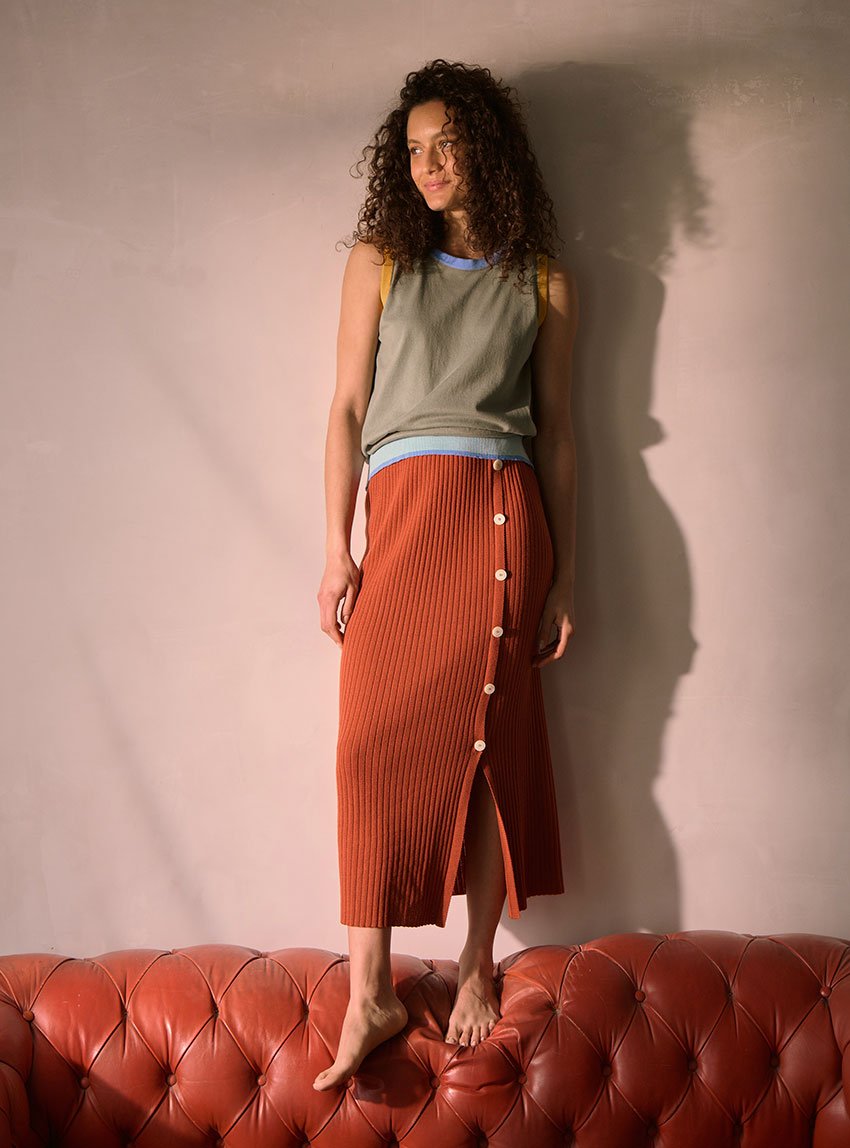 La jupe Charlotte en orange caramel affirme une silhouette longiligne grâce à sa maille en côte Richelieu, au tombé structuré et au confort enveloppant. Tricotée en 100% laine fine mérinos, elle allie technicité et douceur, jouant sur la verticalité des côtes pour élancer la ligne tout en apportant du mouvement. Sa teinte orange caramel, chaleureuse et subtilement épicée, capte la lumière avec douceur et modernité. Elle est sublimée par une ceinture tubulaire rayée violet nuit et blanc, ajoutant une note contrastée et graphique. Une seule boutonnière vient souligner la fausse patte, détail discret mais résolument mode. Une pièce singulière, pensée pour conjuguer élégance urbaine et confort feutré. Parfaite pour les journées au bureau ou les sorties en ville, la jupe Charlotte est un incontournable pour celles qui aiment marier couleur et élégance. On adore la porter avec notre pull Aglaé dans son coloris orange caramel pour un total look.