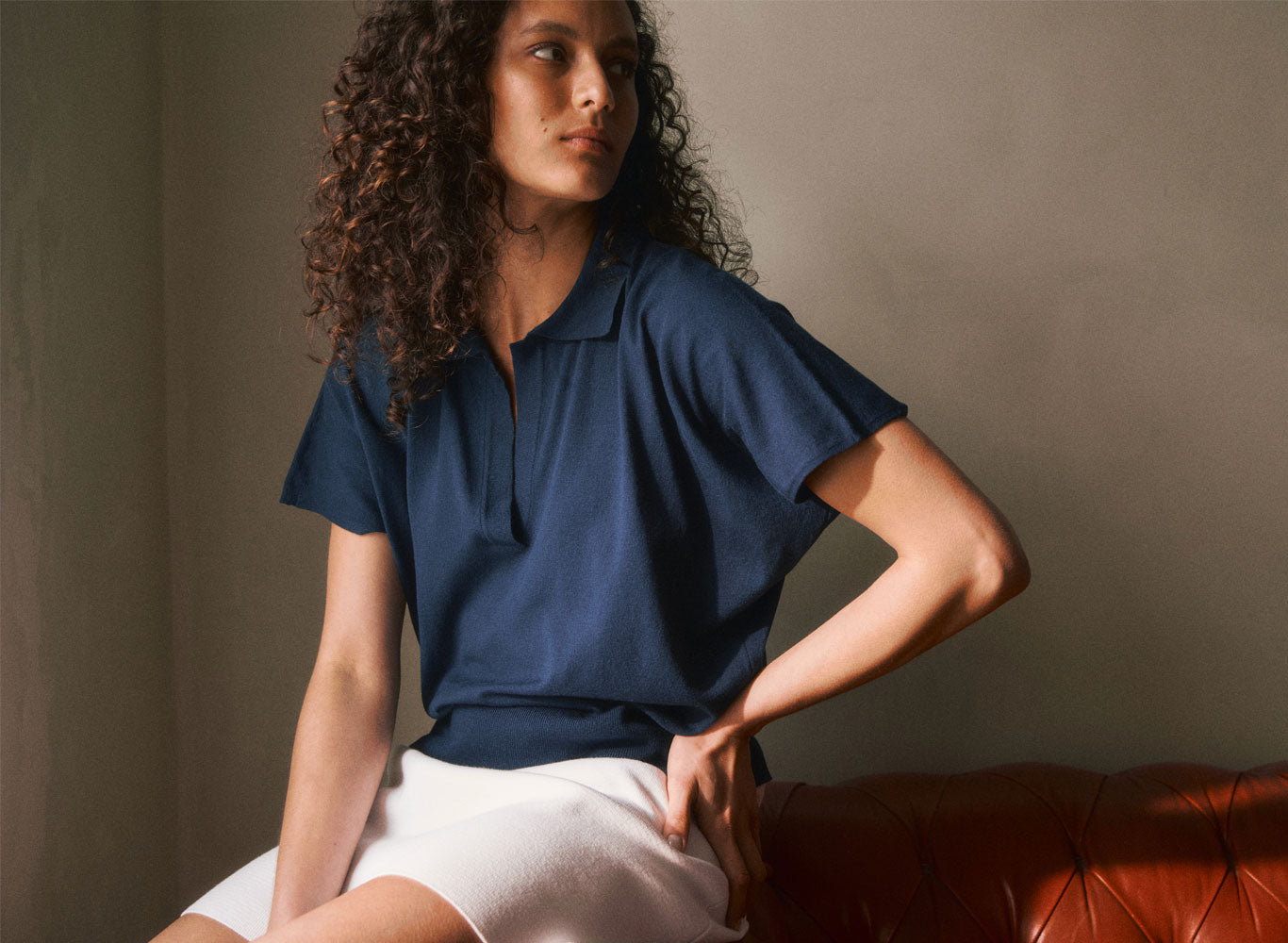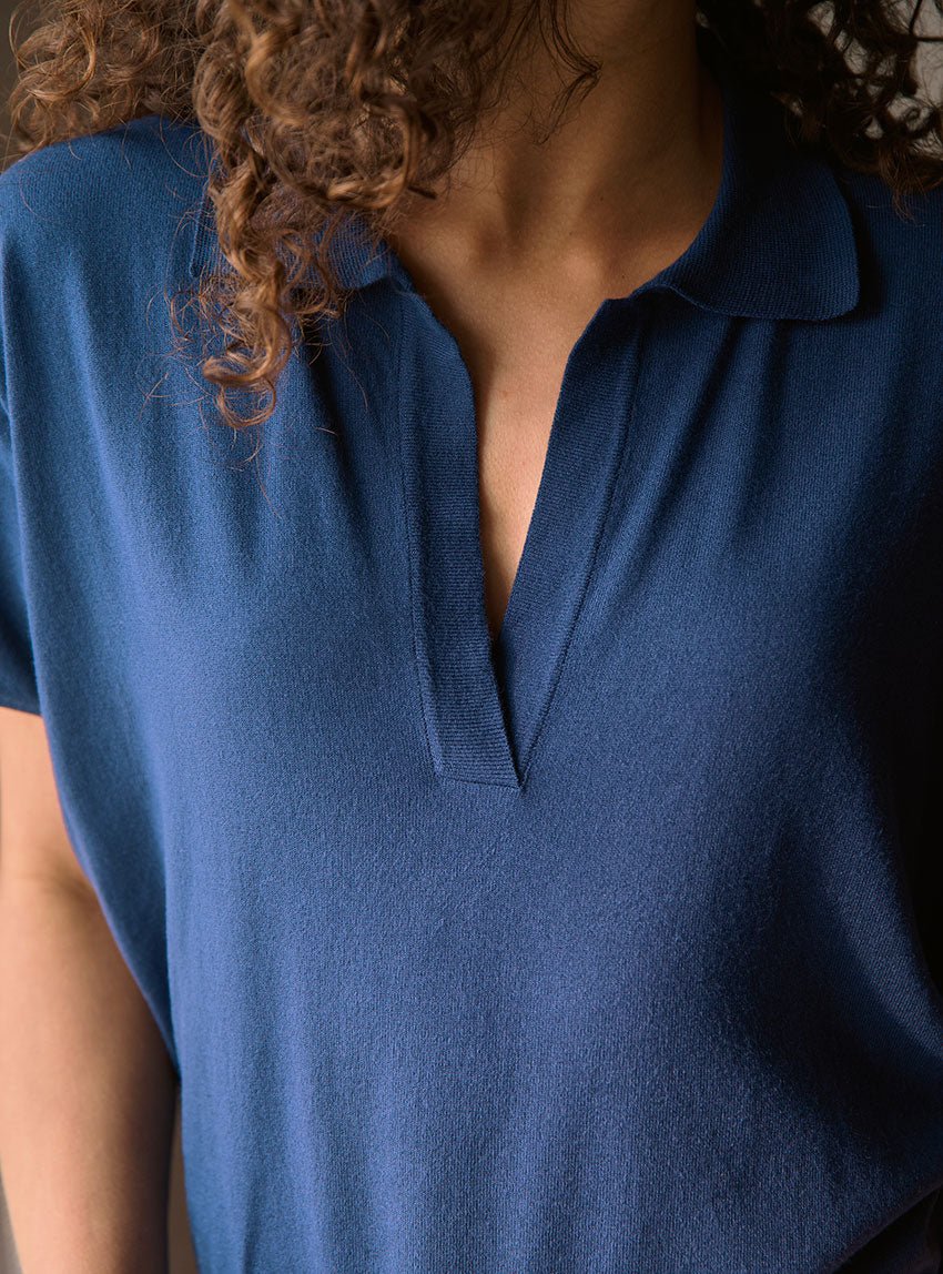 Le polo Delphine bleu marine se distingue par sa maille délicate en jersey fin, composée de 85% viscose et 15% polyester, pour une douceur exquise et un tombé impeccable. Ce mélange de matières confère à la pièce un confort exceptionnel, tout en offrant une grande légèreté et une certaine élasticité, permettant une coupe fluide et agréable à porter.