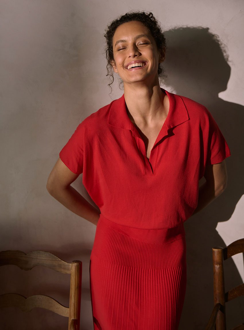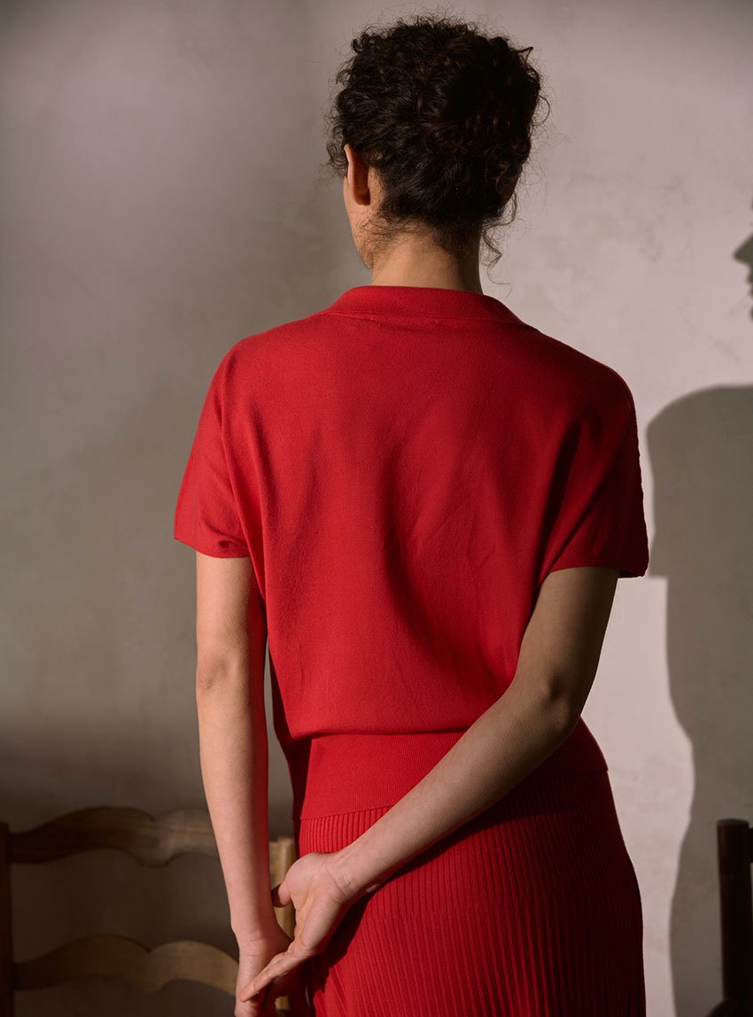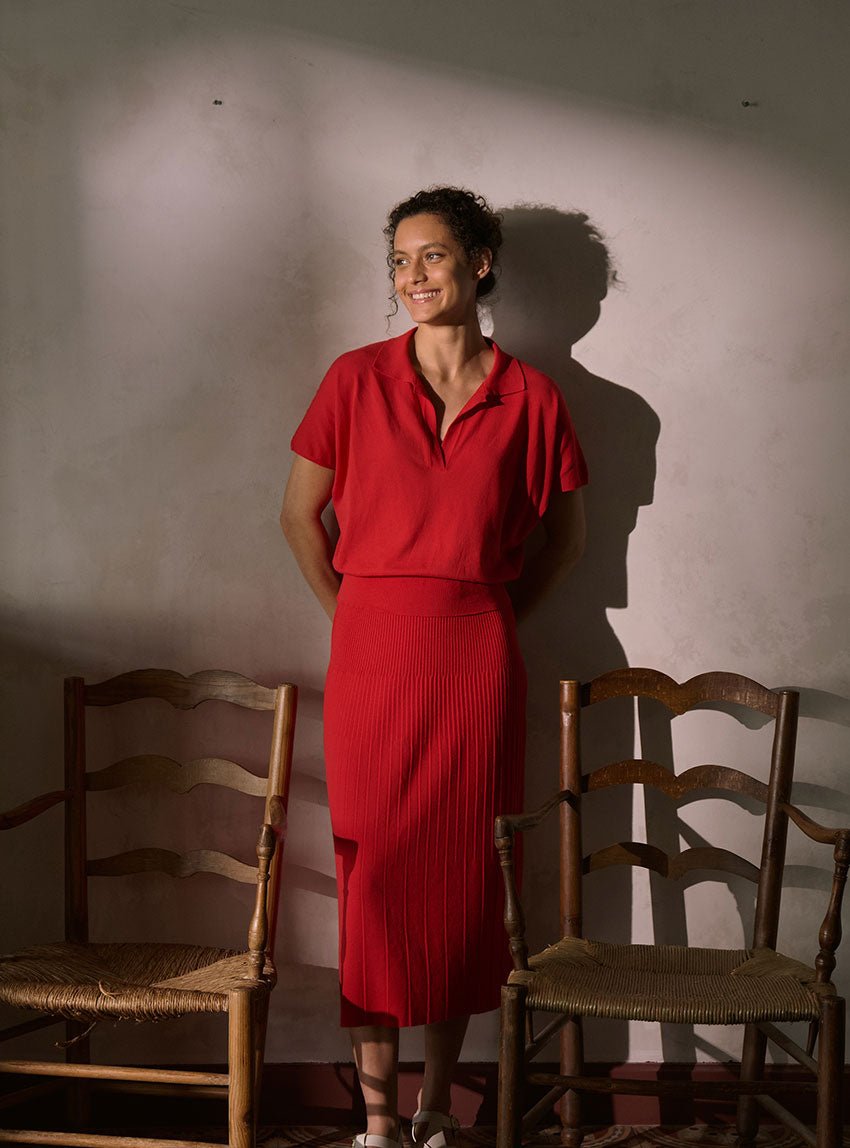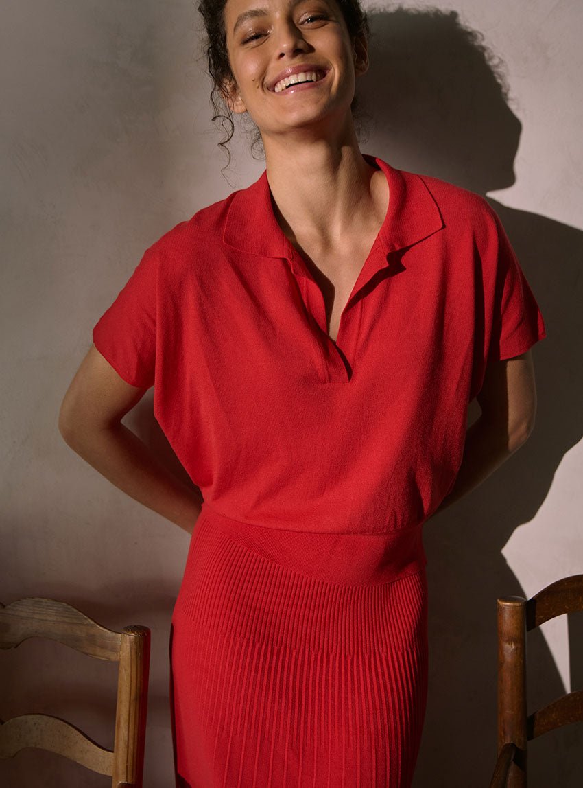 Le rouge lipstick illumine la silhouette avec assurance. Il évoque un rouge franc légèrement rosé, à la fois profond et lumineux. Une nuance vibrante qui s'affirme sans arrogance, et qui flatte toutes les carnations. Associée à une coupe sobre et épurée, cette teinte fait du polo Delphine un essentiel fort, parfait pour celles qui aiment conjuguer confort et impact visuel.
