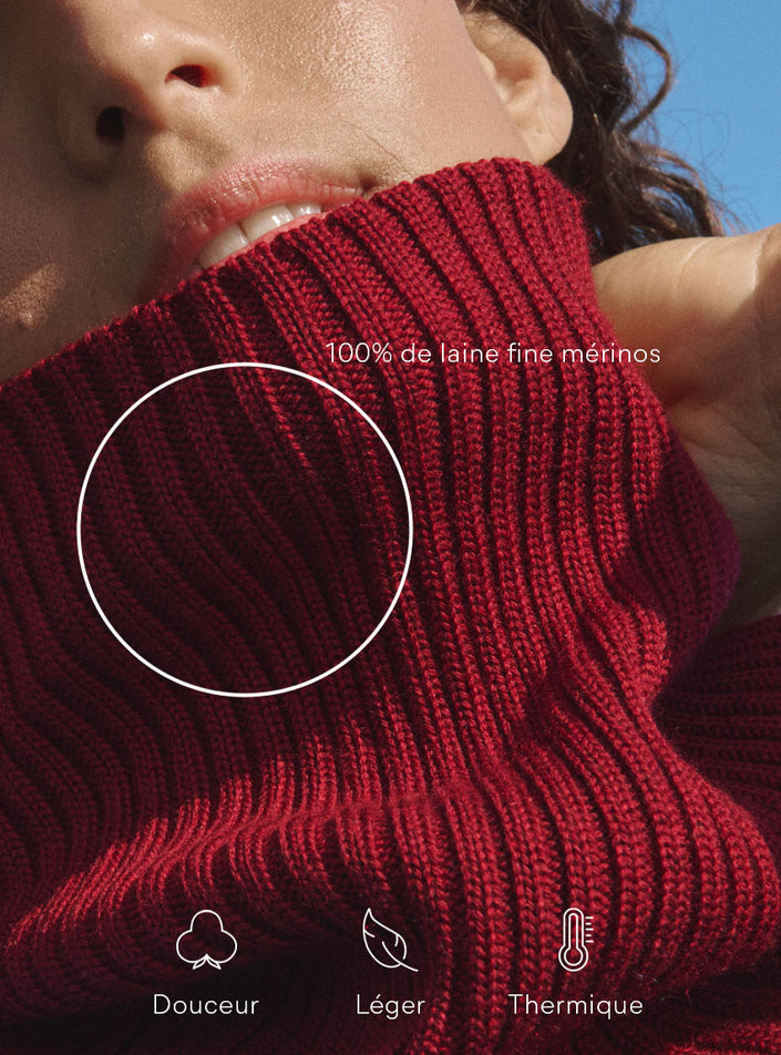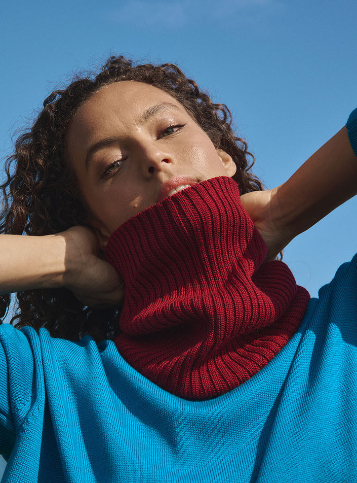 Dans sa teinte rouge bourgogne, profonde et vibrante, ce col incarne l’élégance hivernale. Cette couleur chaleureuse capte la lumière avec intensité, évoque la richesse du vin et se marie à merveille avec des tons neutres comme le beige, le gris ou le noir, mais aussi avec des teintes plus vives pour des associations audacieuses.