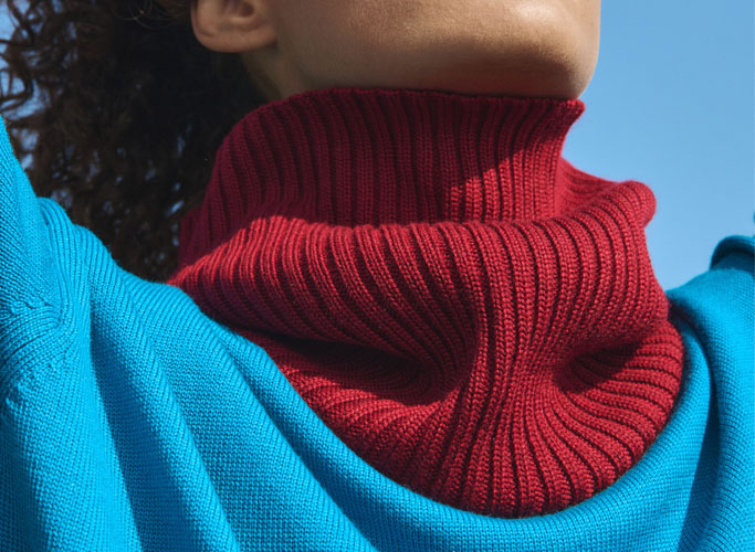 La maille côtelée 2x2 du col Anaïs offre un relief subtil et rythmé, jouant sur des alternances de côtes serrées et souples qui créent un effet visuel élégant et une grande élasticité. Elle épouse naturellement le cou, apportant confort et chaleur sans jamais alourdir la silhouette.
