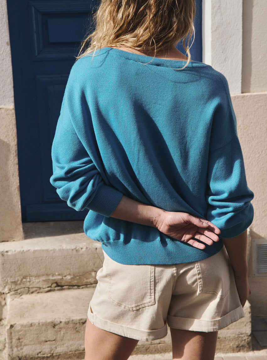 Le bleu curaçao est une teinte vive et rafraîchissante, inspirée des lagons tropicaux et du célèbre cocktail éponyme. À mi-chemin entre un bleu azur éclatant et une nuance légèrement turquoise, il insuffle une énergie lumineuse et une touche estivale à une pièce intemporelle comme le pull Aglaé. Sur une maille jersey en laine fine mérinos, ce bleu intense révèle toute sa profondeur et son éclat. Il capte la lumière avec subtilité, apportant une sensation de fraîcheur et de dynamisme au vêtement. Son intensité en fait une couleur audacieuse qui attire le regard, tout en restant facile à porter grâce à son équilibre parfait entre vivacité et élégance. Le bleu curaçao se marie à merveille avec des tons neutres comme le blanc naturel, le gris perlé ou le beige, pour un look épuré et raffiné.