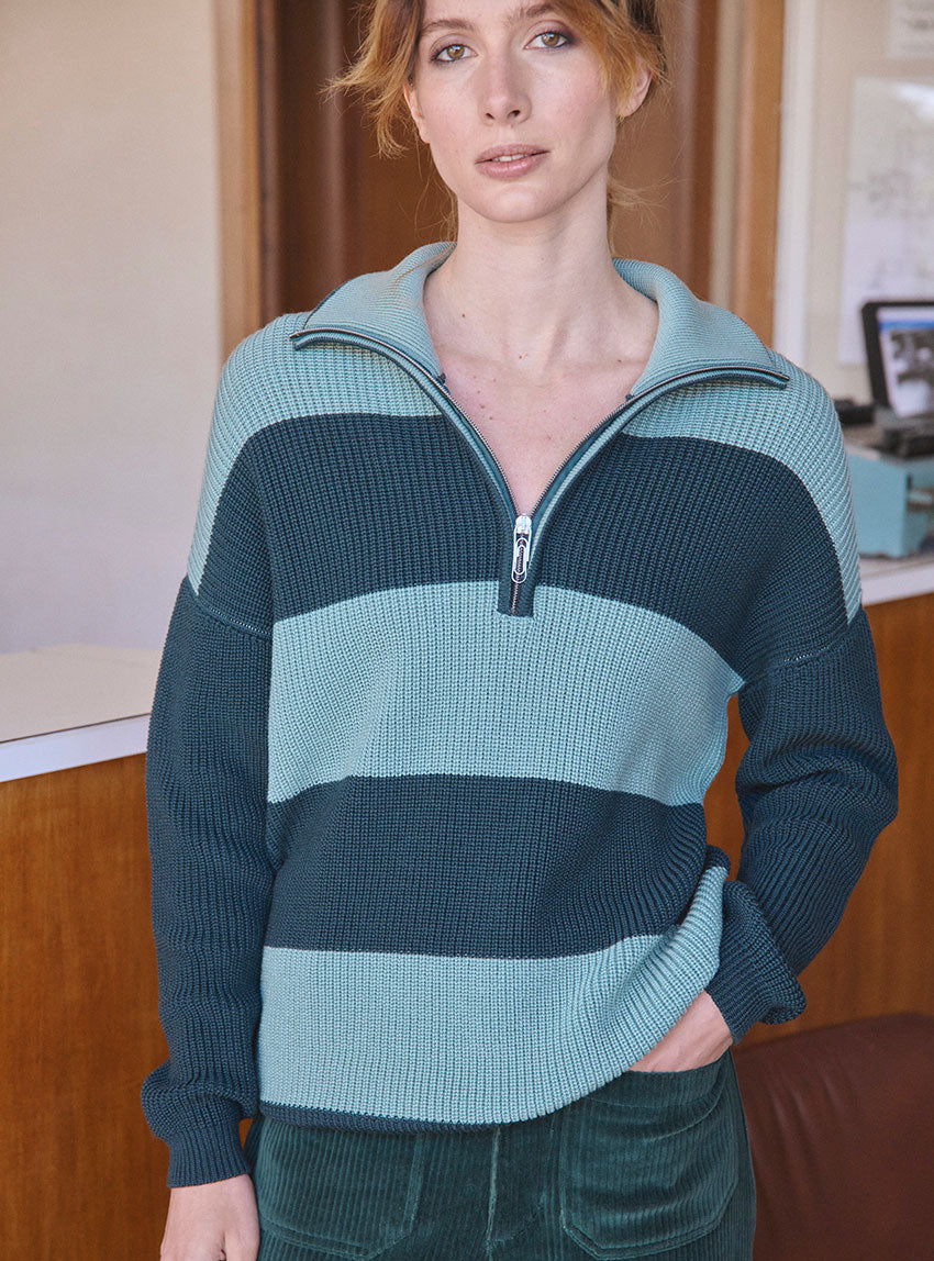 Le pull Claudia vert sombre est une pièce forte, où la maille perlée — dense, texturée et moelleuse — sculpte une allure à la fois ample et précise. Son jeu de rayures bicolores, alternant vert sombre et vert sauge sur le corps, crée un contraste subtil mais marqué, comme une respiration chromatique au cœur de l’hiver. Les manches, volontairement unies, tempèrent cette dynamique et équilibrent la silhouette. Le col camionneur zippé, détail signature du modèle, joue lui aussi avec les codes : l’extérieur en vert sombre encadre un intérieur vert sauge, révélant une nuance plus claire à chaque ouverture du zip — comme un clin d’œil graphique et inattendu. Les finitions en bords côtes renforcent le confort et l’allure casual-chic du pull. Pensé pour celles qui aiment les pièces à forte personnalité sans jamais céder sur le confort, le Claudia est une déclaration douce et structurée, à porter seul ou en total look coordonné.