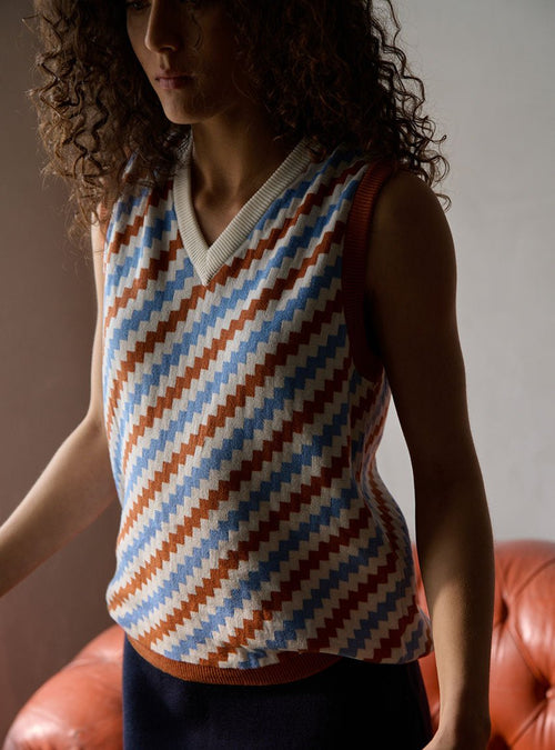 Le pull sans manches Floriane vert matcha révèle une allure contemporaine portée par la richesse subtile de sa maille diagonale bicolore. Son encolure V, soulignée par un col tubulaire délicatement structuré, met en valeur le port de tête avec finesse, tandis que la coupe sans manches dégage les épaules et équilibre naturellement la silhouette. Confectionné en 100 % coton, il offre un toucher doux et respirant, idéal pour la mi-saison comme pour l’été. La maille flottée aux diagonales bicolores crée un relief discret qui capte la lumière et apporte profondeur et modernité à la pièce. Le démarrage en bord-côtes 1x1 resserrant à la taille structure le tombé et souligne subtilement la ligne du corps sans contrainte. D’une longueur d’environ 62 cm, il se porte aussi bien sur une chemise blanche pour un jeu de superpositions élégant qu’avec un pantalon beige, un denim clair ou une jupe fluide pour une silhouette plus épurée. Le vert matcha, doux et végétal, évoque une fraîcheur naturelle et insuffle une note apaisante et lumineuse au vestiaire. Lavable en machine, le modèle Floriane conjugue savoir-faire maille et confort contemporain dans une pièce pensée pour durer.