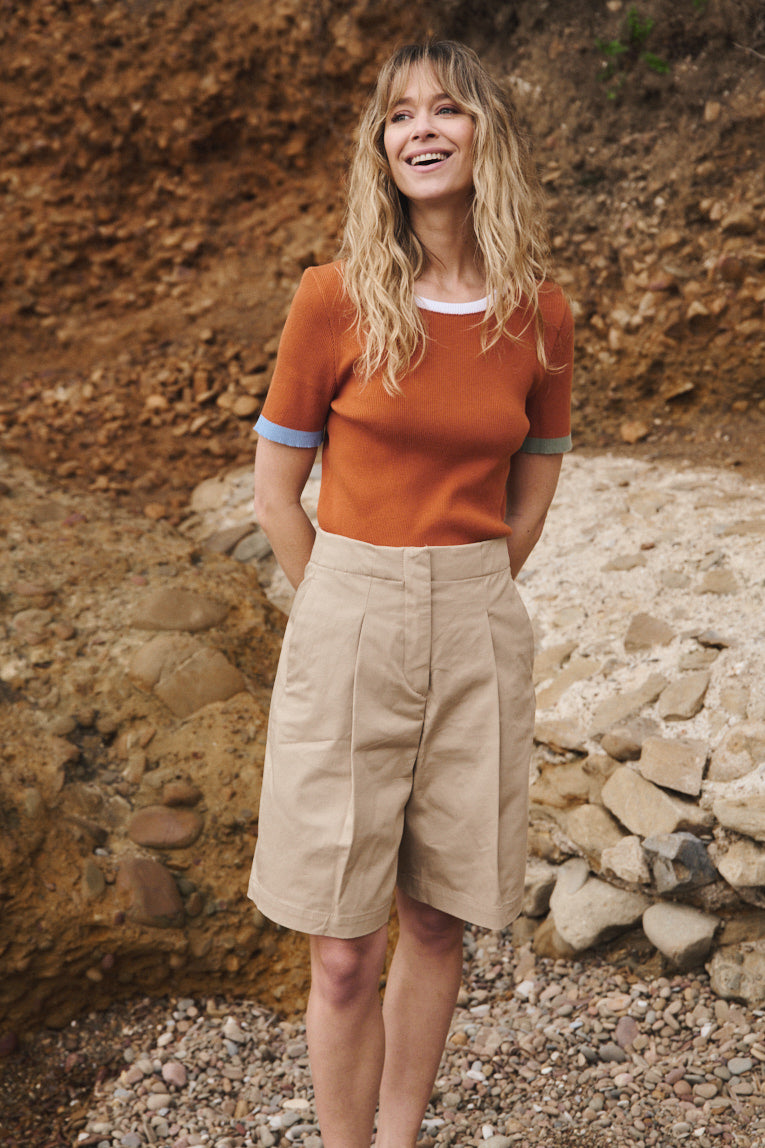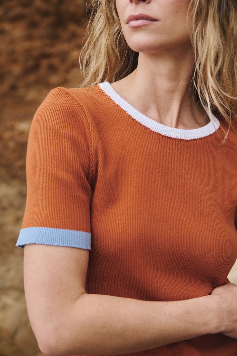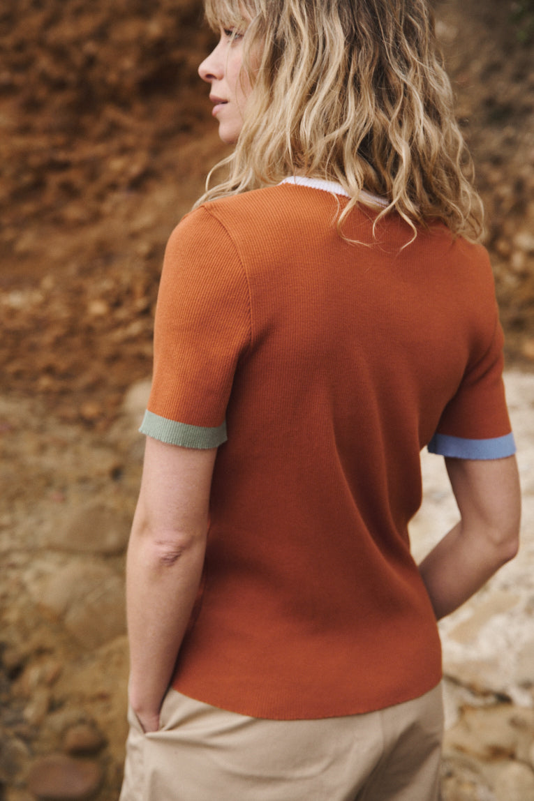 Avec son allure graphique et sa maille en côtes 2x2, le top Bastienne s’impose comme un essentiel revisité. Tricoté en coton 100%, il mêle confort et structure dans un tombé souple et affirmé. Son encolure ronde bordée de blanc contraste avec justesse, tandis que les rayures placées au démarrage des manches — bleu aster à droite, vert kaki à gauche — apportent une touche de fraîcheur et de caractère. La teinte marron terre de sienne qui habille l’ensemble évoque la chaleur du sol, la matière brute, une intensité organique qui ancre la silhouette dans une palette profonde et naturelle. C’est une couleur forte, presque minérale, que les détails colorés viennent réveiller avec un twist contemporain et lumineux.