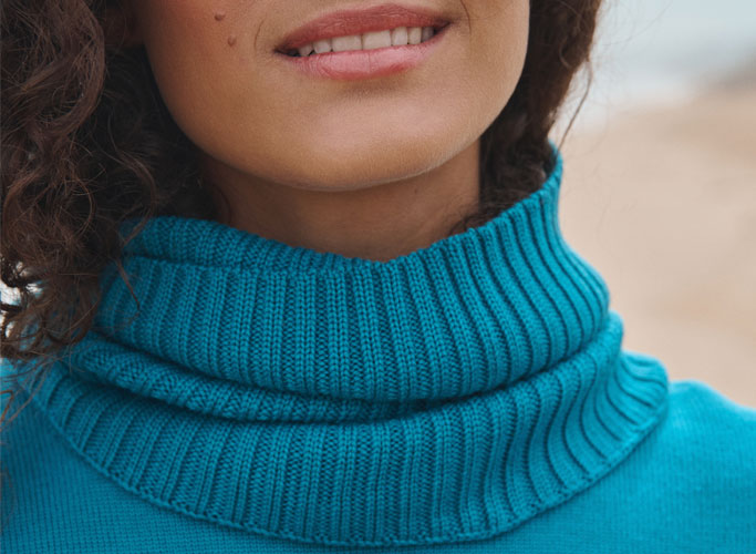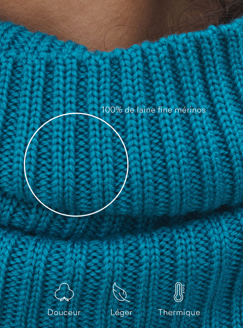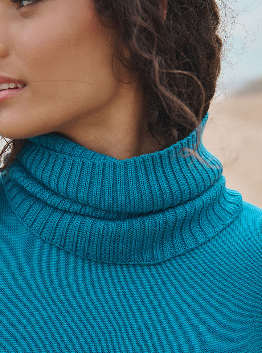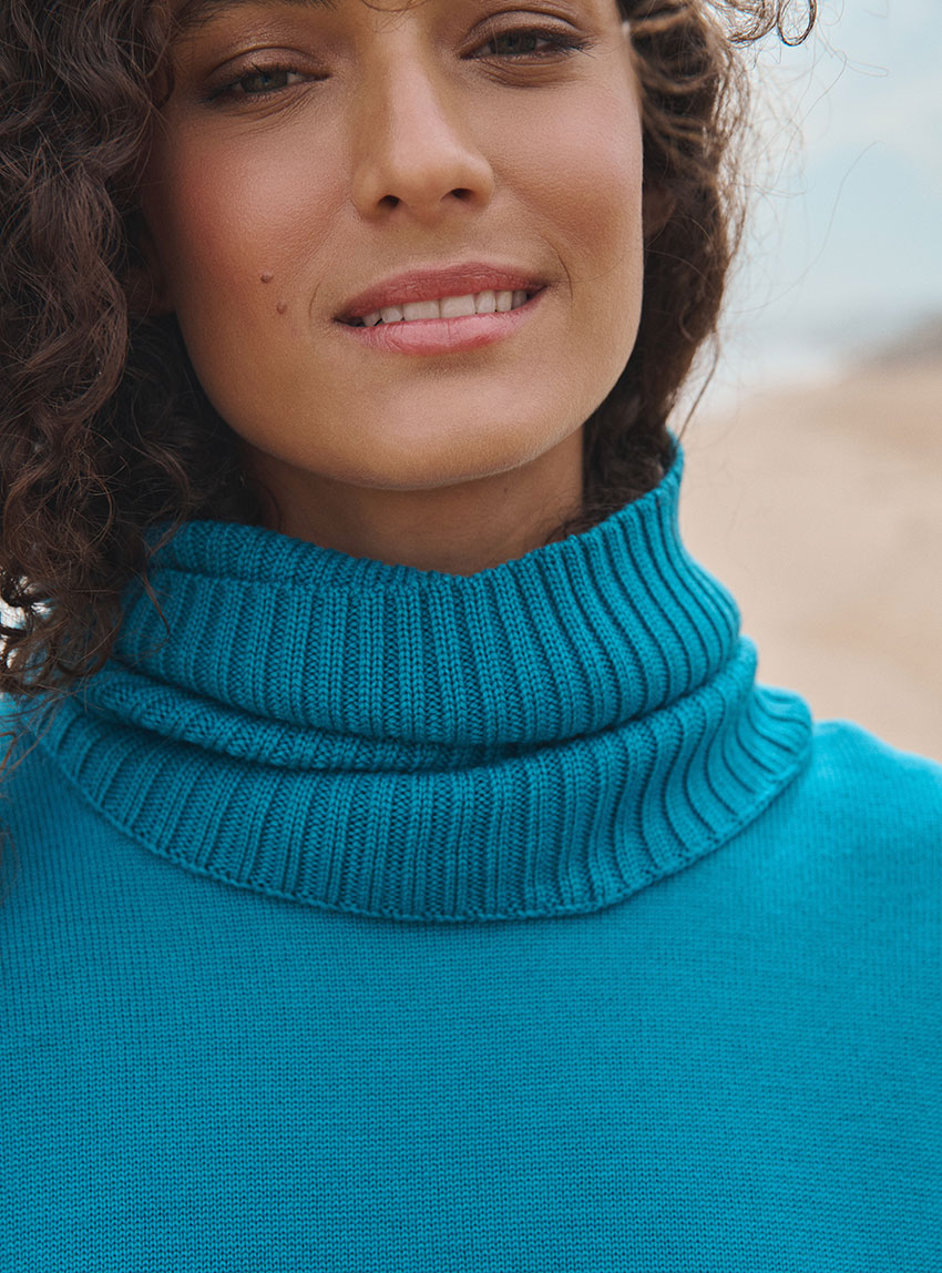 Le col Anaïs bleu atlantique se distingue par sa maille côtelée 2x2, qui joue sur les contrastes de relief pour offrir souplesse, confort et maintien. Cette texture régulière capte la lumière et souligne la qualité de la laine mérinos fine, connue pour sa douceur et sa chaleur naturelle.
