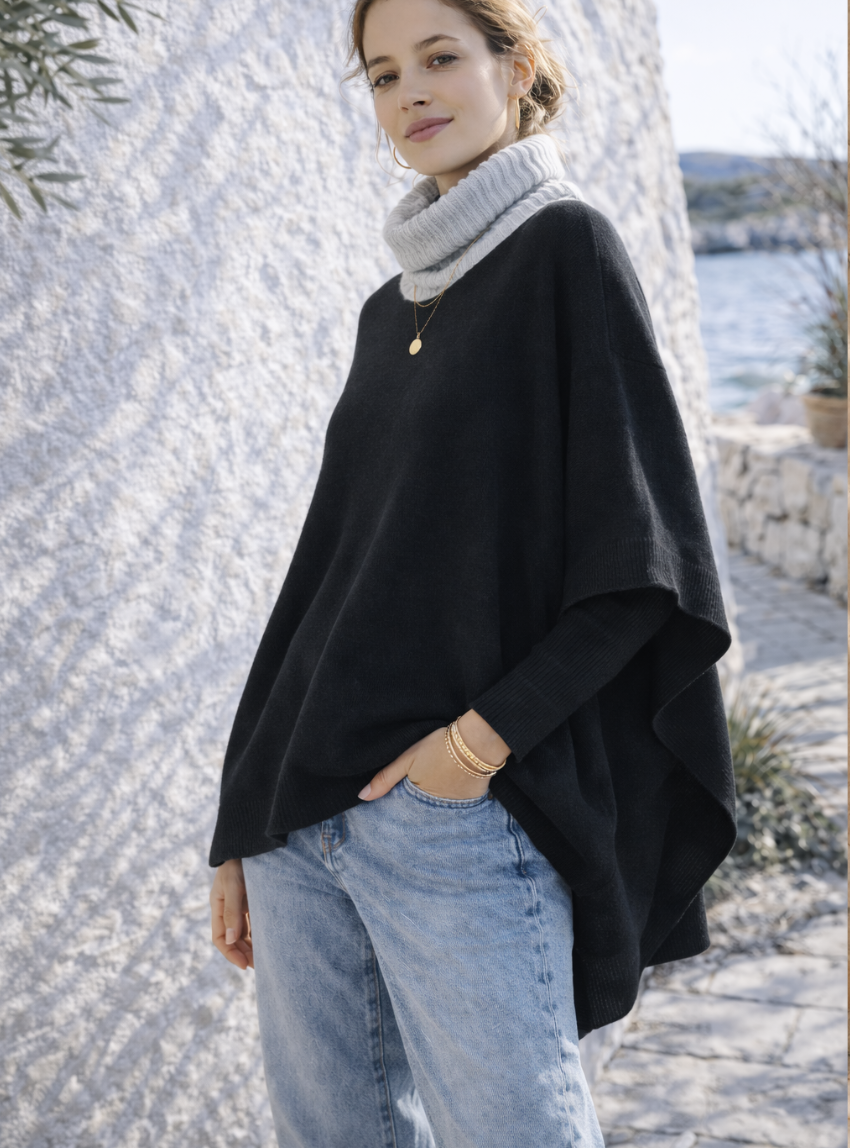 Le noir profond du corps du poncho en fait une pièce intemporelle, facile à associer et naturellement élégante. Il est réveillé par un col roulé contrasté en gris souris, une teinte douce et minérale qui apporte de la lumière et une touche contemporaine. Ce duo de couleurs sobres et raffinées permet au poncho Anaé de s’adapter aussi bien à une silhouette décontractée qu’à un look plus habillé.