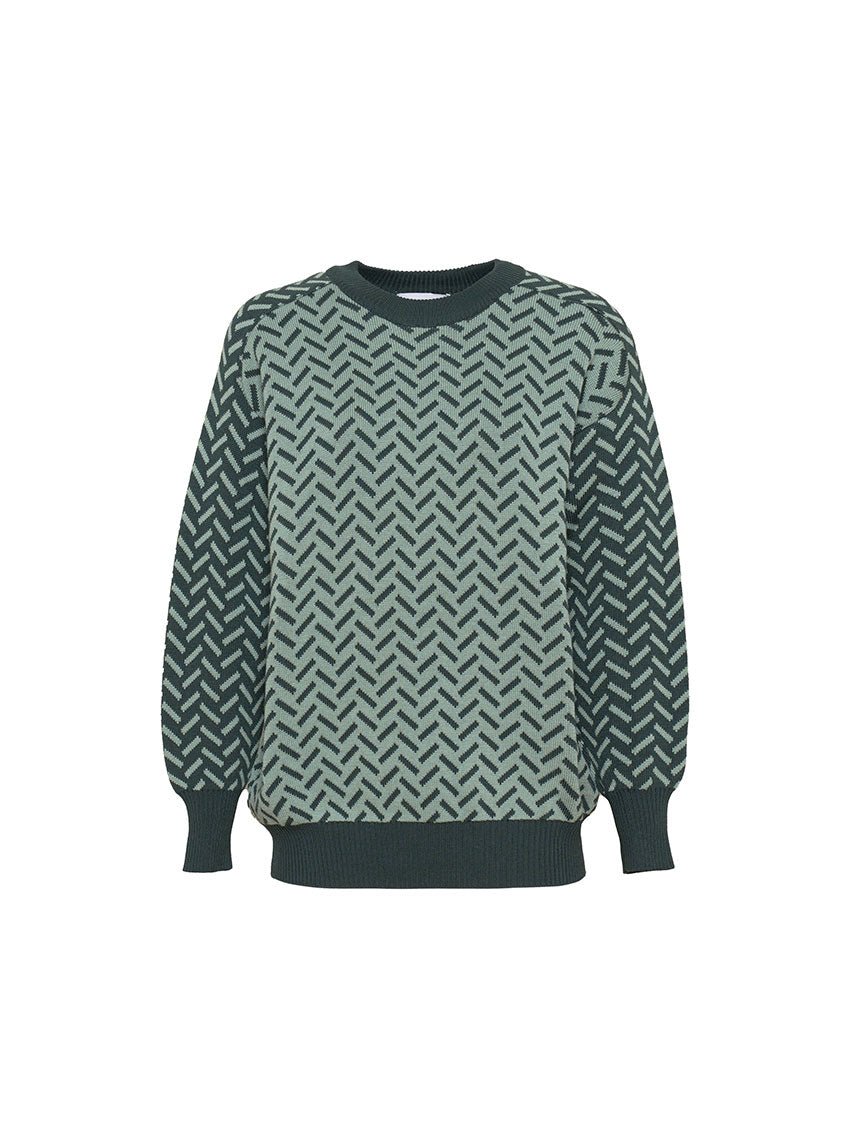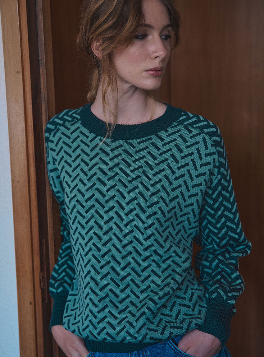 Côté couleurs, le vert sauge s'impose en teinte dominante, lumineuse et apaisante, tandis que les touches de vert sombre, en contraste sur les bords côtes et le col redoublé, structurent l’ensemble. Ce duo végétal évoque une élégance naturelle, légèrement vintage, tout en inscrivant la pièce dans une modernité affirmée. Le pull Cindy incarne un équilibre raffiné entre ton sur ton subtil et graphisme assumé.