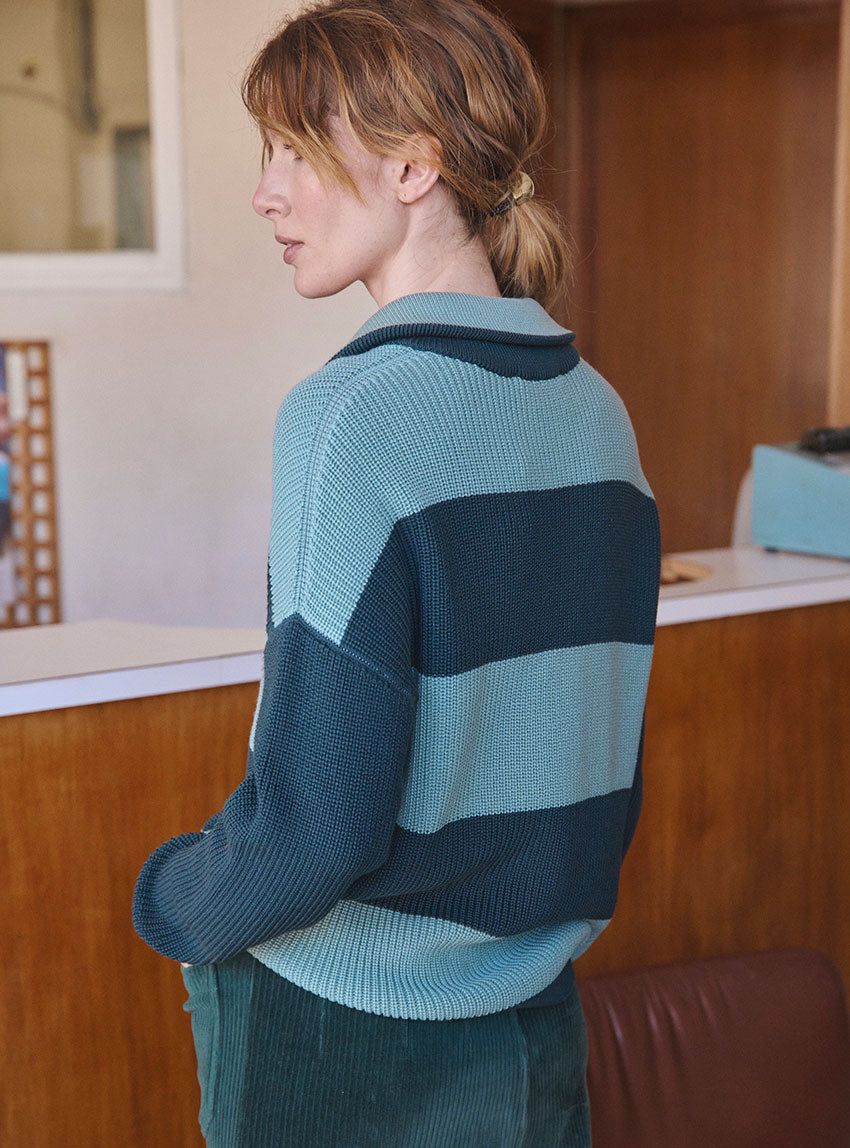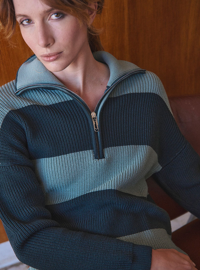 Le pull Claudia vert sombre est une pièce forte, où la maille perlée — dense, texturée et moelleuse — sculpte une allure à la fois ample et précise. Son jeu de rayures bicolores, alternant vert sombre et vert sauge sur le corps, crée un contraste subtil mais marqué, comme une respiration chromatique au cœur de l’hiver. Les manches, volontairement unies, tempèrent cette dynamique et équilibrent la silhouette. Le col camionneur zippé, détail signature du modèle, joue lui aussi avec les codes : l’extérieur en vert sombre encadre un intérieur vert sauge, révélant une nuance plus claire à chaque ouverture du zip — comme un clin d’œil graphique et inattendu. Les finitions en bords côtes renforcent le confort et l’allure casual-chic du pull. Pensé pour celles qui aiment les pièces à forte personnalité sans jamais céder sur le confort, le Claudia est une déclaration douce et structurée, à porter seul ou en total look coordonné.