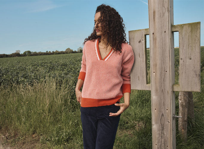 Couleur et confort. Le pull Cléo revisite la coupe oversize avec une audace bicolore : orange nubuck intense sur le devant, rose poudre doux en contraste à l’encolure en V. Tricoté en maille perlée avec une côte anglaise sur le dessus, il offre une texture chaleureuse et volumineuse. Les manches longues à emmanchures descendues s’achèvent sur un bord-côte 1x1 ton sur ton, pensé pour maintenir la tenue du vêtement sans comprimer. L’encolure en V est réalisée en côtes redoublées – une finition plus épaisse et texturée, à la fois confortable et visuellement structurante. Le mélange noble de laine mérinos extrafine et de cachemire garantit une douceur incomparable. Comme toutes nos pièces, le pull Cléo est entièrement conçu, tricoté et assemblé en France, dans notre atelier familial situé à Villers-Bocage, en Normandie. Un pull 100% local, à faible impact, qui valorise l'artisanat textile français.