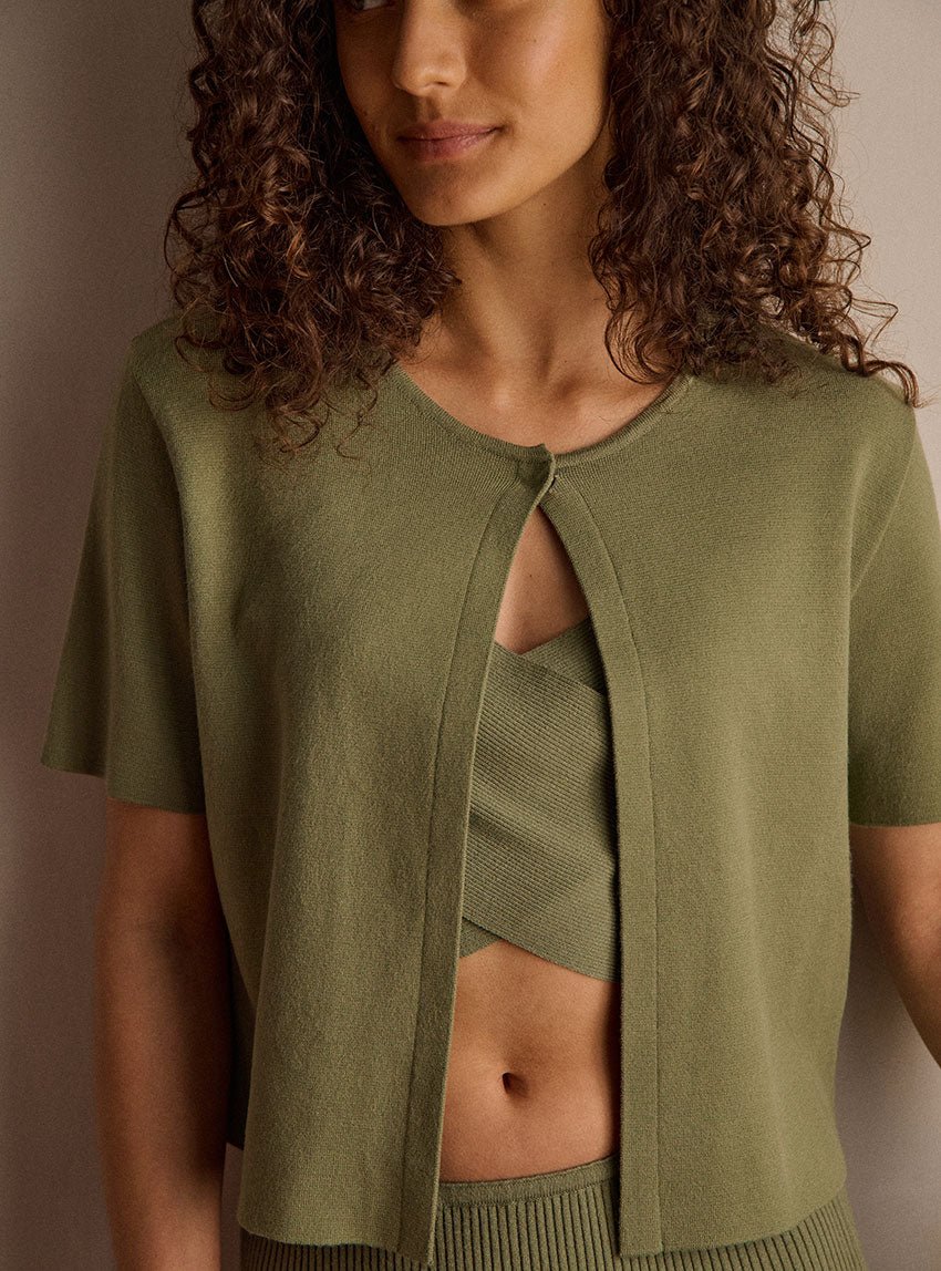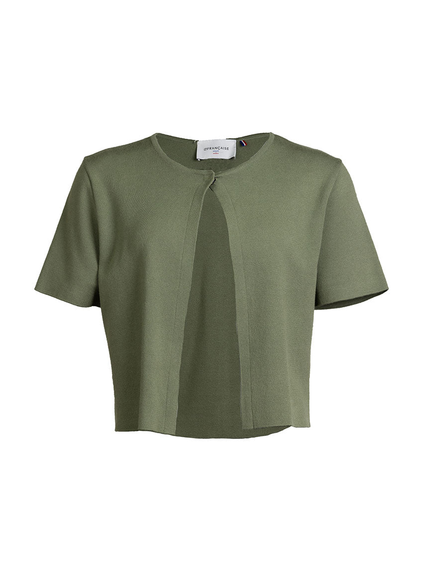 Minimaliste, fluide, affirmé : le cardigan Diane vert kaki se distingue par sa coupe courte et structurée, idéale pour twister un look casual ou affirmer une silhouette plus habillée. Tricoté en point de Rome — une maille dense, au tombé net et soigné — il offre un confort seconde peau tout en gardant une belle tenue. L’encolure ras du cou et les manches courtes renforcent son esprit moderne et graphique, tandis que la patte de boutonnage à même, finement repliée et piquée, révèle une élégance discrète avec ses pressions invisibles. La teinte vert kaki, subtilement désaturée, ancre cette pièce dans une palette naturelle et sophistiquée.
