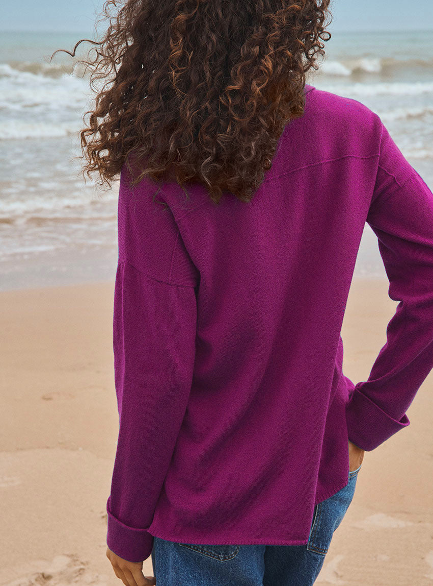La chemise Éléonore en violet digital revisite la surchemise avec une touche de sophistication et de modernité. Sa maille jersey en laine mérinos extrafine et cachemire offre un toucher d’une douceur incomparable et un tombé souple qui sublime la silhouette. Sa coupe oversize et ses emmanchures descendues lui donnent une allure décontractée, tandis que les détails soignés comme le col polo, la patte de boutonnage tricotée à même et poches plaquées, signent un savoir-faire raffiné. Le coloris violet digital, vibrant et lumineux, insuffle une énergie contemporaine à ce modèle. Portée ouverte sur un t-shirt, fermée façon chemise ou superposée à un pull fin, Éléonore s’adapte à toutes les envies et devient une pièce forte du vestiaire, à la fois chic et décontractée.