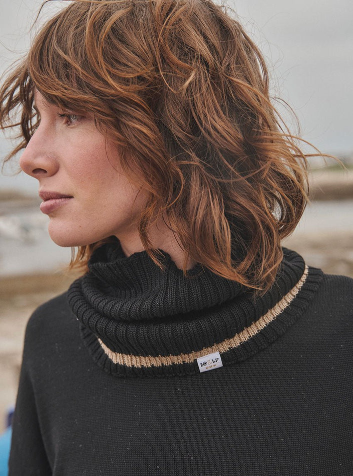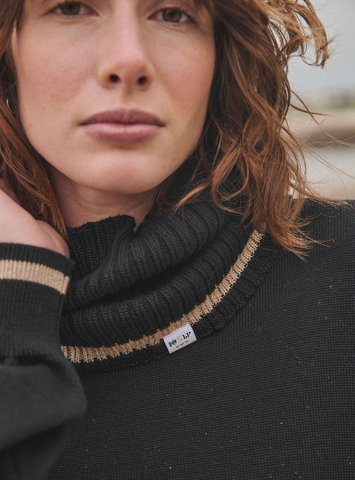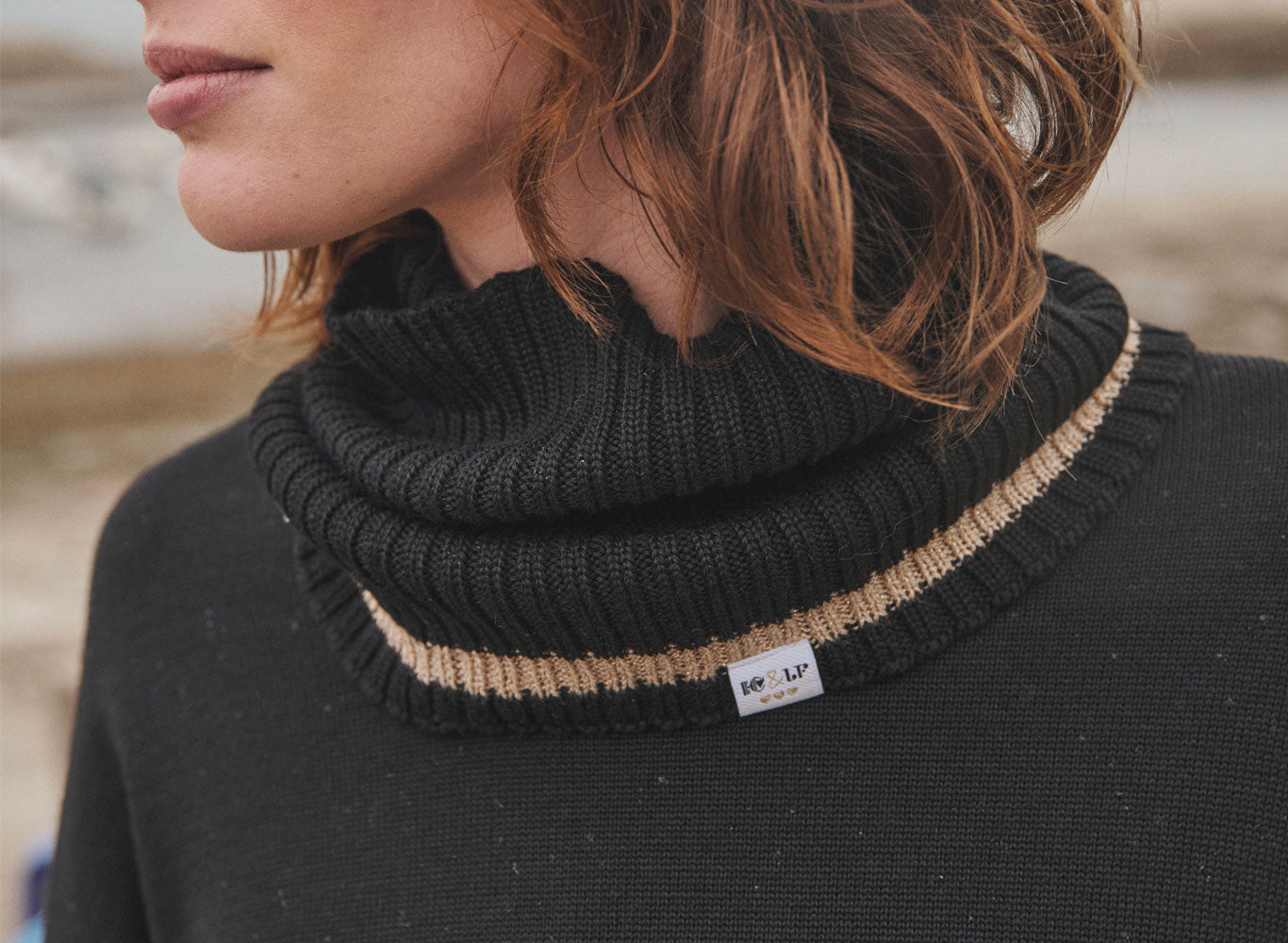 Le noir intense du tricot, profond et intemporel, est rehaussé par une bande en lurex doré qui souligne l'ensemble d'une touche lumineuse et précieuse. Ce contraste subtil entre matité profonde et éclat doré fait du col Anaïs un accent moderne et raffiné, parfait pour twister une tenue avec une note discrète d’éclat.