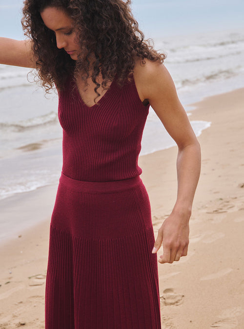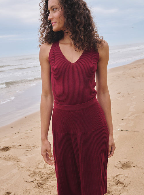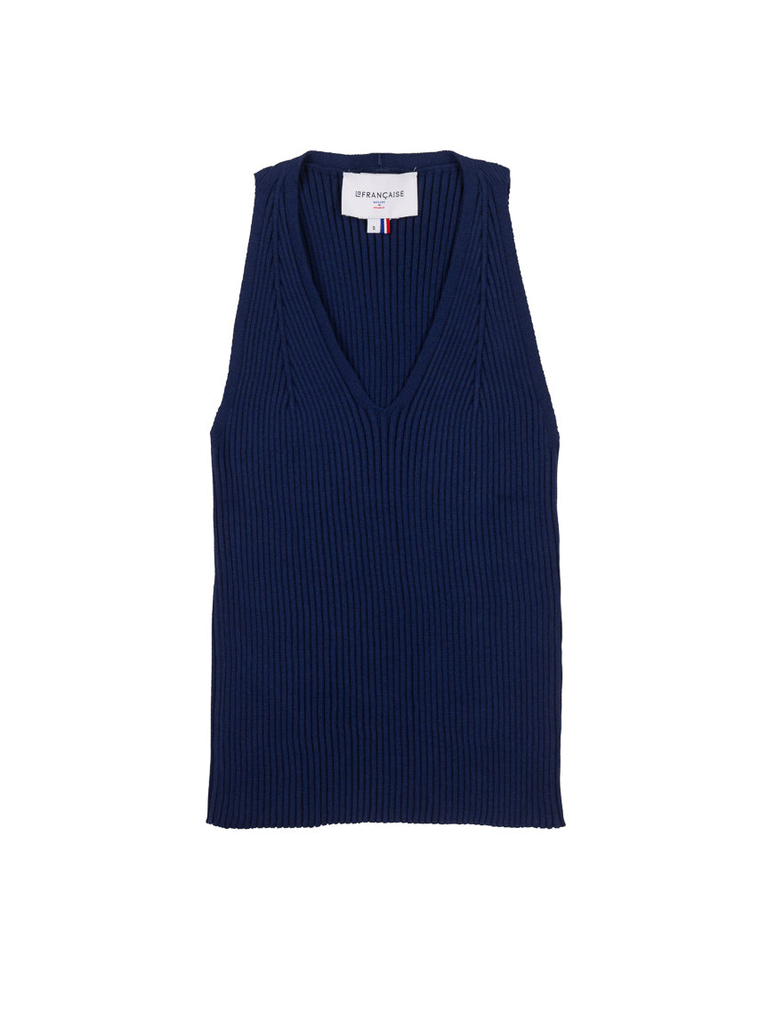 Le top Francine bleu marine révèle une élégance sobre et affirmée, portée par une ligne sans manches qui dégage délicatement les épaules et allonge la silhouette. Son encolure V, tricotée en diminué, est travaillée avec précision pour créer un effet de pinces poitrine intégré à la maille, offrant un galbe naturel et une tenue harmonieuse sans couture apparente. La construction en côtes souligne subtilement les lignes du corps tout en conservant une grande liberté de mouvement. Confectionné en 85 % viscose et 15 % polyester, il associe la douceur et la fluidité de la viscose à la stabilité du polyester, garantissant un tombé souple et une belle tenue dans le temps. D’une longueur de 56 cm, il se porte aussi bien glissé dans un pantalon taille haute que posé sur une jupe fluide pour une allure plus aérienne. Le bleu marine, profond et intemporel, apporte une sophistication naturelle et s’accorde avec un blanc lumineux, un beige chaud ou un denim brut pour une silhouette équilibrée et raffinée. Lavable en machine, le débardeur Francine conjugue précision technique et confort moderne dans une pièce essentielle du vestiaire.