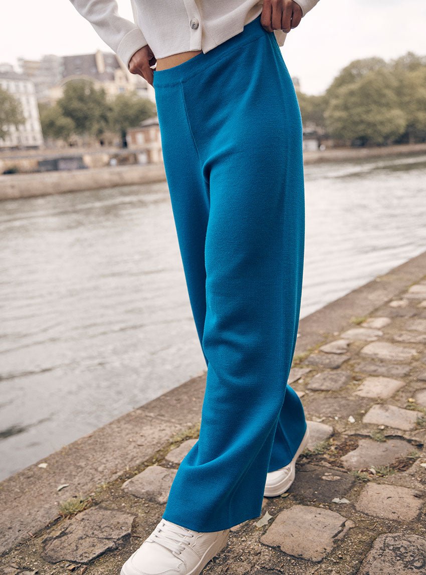 Le pantalon Alexia en rouge foncé allie élégance fluide et confort naturel. Confectionné en 100% laine fine mérinos, il adopte une coupe ample et structurée grâce à sa maille point de Rome, réputée pour sa tenue et son tombé net. La ceinture tubulaire rapportée avec élastique assure un maintien souple, tout en soulignant la taille sans la comprimer. Un essentiel du vestiaire féminin à porter seul ou en total look avec une maille coordonnée.