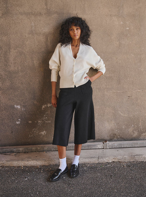 Le pantalon Alexia est tricoté en maille point de Rome, une maille double réputée pour sa structure dense, son tombé impeccable et son maintien naturel. Grâce à cette construction spécifique, la maille ne se déforme pas, elle épouse le mouvement tout en conservant une silhouette nette. C’est une maille qui allie souplesse et tenue, idéale pour des pièces à la coupe ample et élégante comme celle-ci.