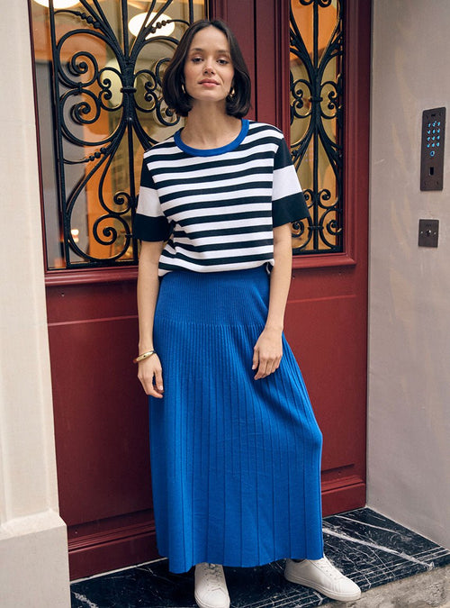 Le polo Delphine en bleu marine est une pièce intemporelle qui incarne l'élégance moderne. Confectionné en jersey fin de 85% viscose et 15% polyester, ce modèle léger et agréable à porter s’adapte à toutes les occasions. Ses manches kimono fluides et son col sans boutons lui confèrent une allure à la fois décontractée et raffinée. La signature LF ajourée, placée discrètement en bas à droite, ajoute une touche subtile de sophistication. Le bleu marine, couleur profonde et pleine de caractère, apporte à ce polo une dimension intemporelle, tout en étant remarquablement facile à associer. L’alliance avec la jupe Blondie blanche crée un contraste parfait : le bleu marine, à la fois sobre et élégant, se marie à la pureté lumineuse du blanc pour un look chic et sans effort. Ensemble, ces deux pièces conjuguent chic et simplicité, offrant une silhouette élégante, idéale pour toutes les occasions.