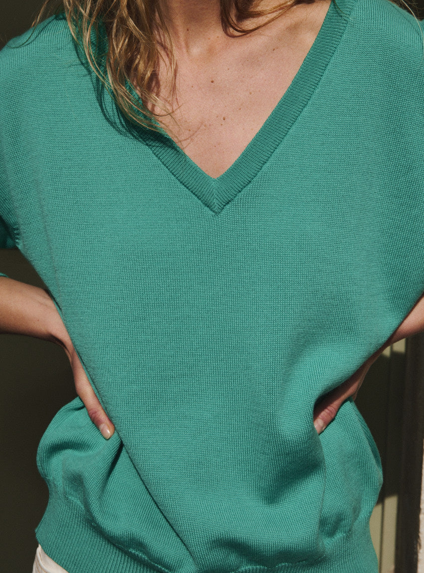 Le pull Aglaé vert menthe incarne une féminité intemporelle et un raffinement naturel, pensé pour sublimer le quotidien avec simplicité. Son encolure V délicate met en valeur le port de tête, tandis que sa coupe élégante et confortable (longueur environ 62 cm) en fait une pièce idéale à porter aussi bien rentrée dans un pantalon taille haute que laissée fluide sur une jupe ou un jean. Ses finitions soignées, comme le démarrage bord-côte 1x1, témoignent d’un savoir-faire premium jusque dans les détails.