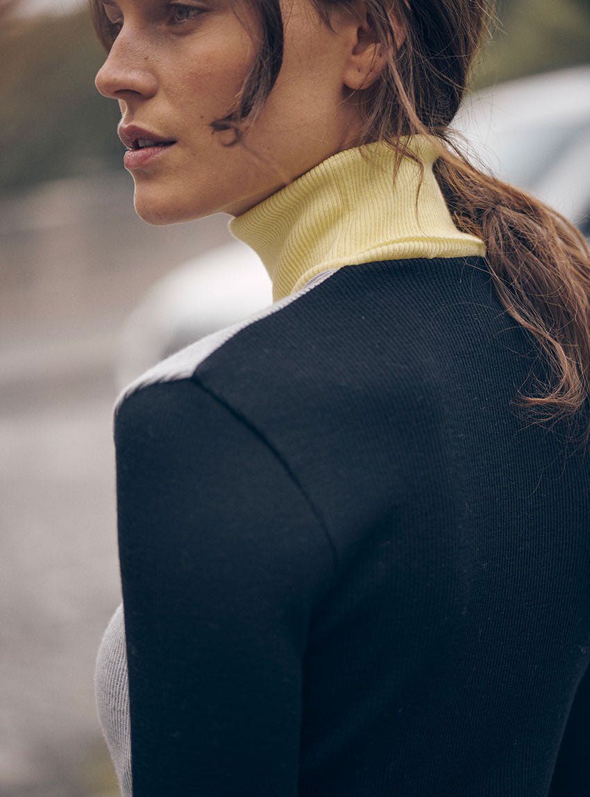 Le pull Amandine est tricoté en côtes 2x1, une maille extensible et structurée qui épouse parfaitement la silhouette tout en offrant un confort optimal. Les côtes 2x1 assurent une belle élasticité et un ajustement près du corps, caractéristique des pulls chaussettes. Cette technique de tricot confère au modèle un effet légèrement nervuré, soulignant l’élégance de sa coupe ajustée. Un jeu de côtes bicolores sur le devant ajoute du relief et de la profondeur visuelle, créant une dynamique intéressante entre les teintes. Le dos et les manches unis en noir apportent une touche plus sobre et épurée, tout en renforçant la structure du modèle. Le col roulé en block color jaune tonique, également tricoté en côtes, accentue le contraste et apporte une finition moderne et audacieuse. Grâce à sa maille en côtes qui conjugue souplesse et tenue, le pull Amandine est une pièce aussi confortable qu'élégante, idéale pour réchauffer une silhouette avec style.