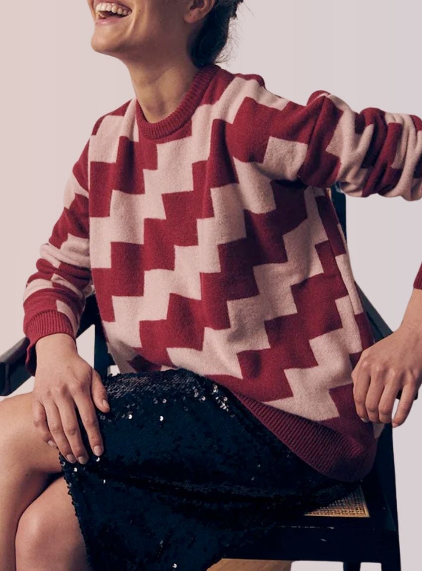 Le pull Angèle fait vibrer l’hiver avec une élégance colorée. Sa maille jacquard double face mêle le rouge foncé profond au rose poudre tendre dans un motif damier en diagonale au graphisme assumé. Sa coupe oversize enveloppe le corps avec douceur, grâce à un mélange noble de laine mérinos extra fine et de cachemire. Le col rond, les manches longues et les finitions côtelées renforcent son allure cosy et contemporaine. Une pièce forte, entre douceur tactile et style affirmé.
