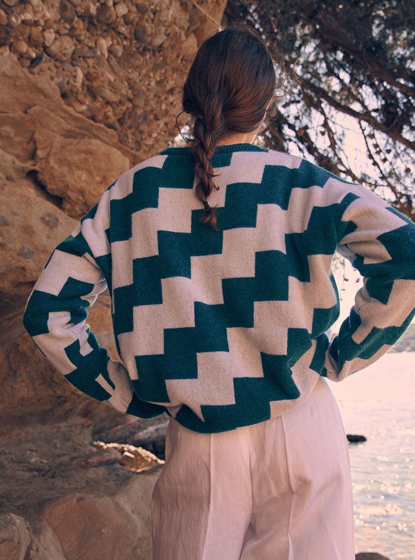 Le pull Angèle explore la richesse du jacquard double face avec audace et subtilité. Sa maille dense en jersey structuré révèle un damier en diagonale qui joue sur les contrastes et la texture.