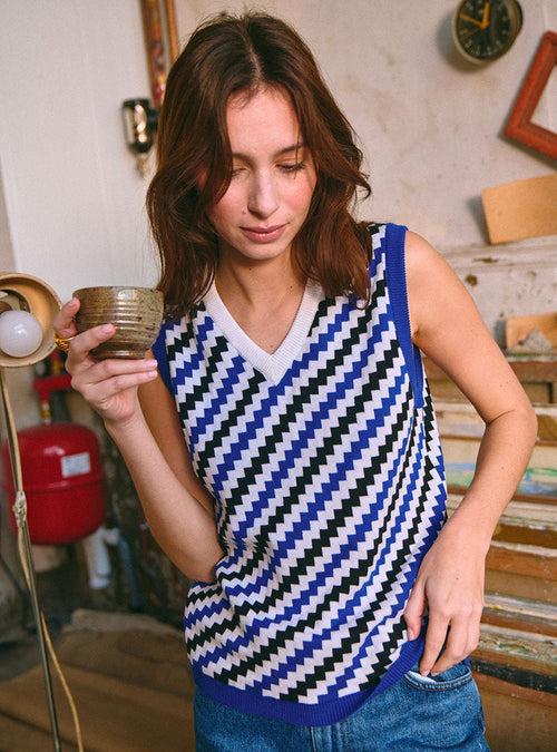 Le bleu mouliné est une teinte nuancée et vibrante qui mêle subtilement plusieurs nuances de bleu. Cette technique de fil mouliné donne un effet légèrement texturé et irrégulier, offrant à la couleur une profondeur unique. Associé ici à des finitions en gris mouliné et en ivoire, le bleu mouliné prend une dimension encore plus moderne. Il apporte une touche de fraîcheur et d’élégance, idéale pour illuminer une tenue hivernale tout en restant intemporel.