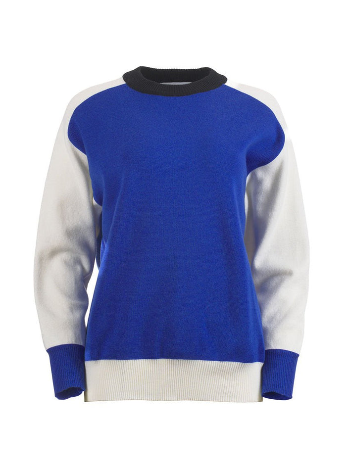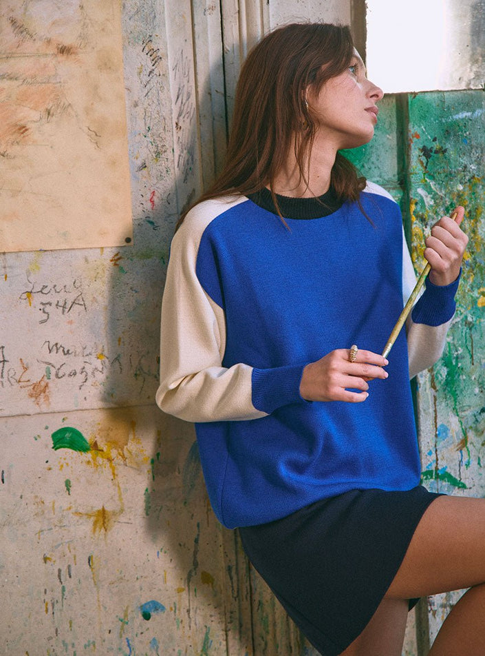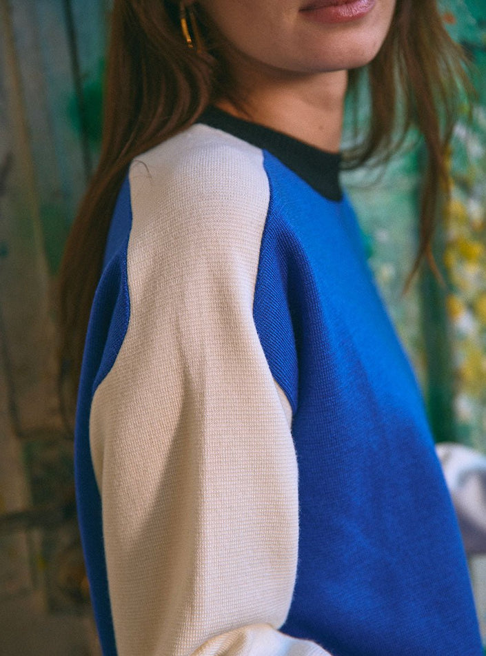 Ce pull joue avec une palette harmonieuse en block color pour un effet visuel moderne et audacieux.