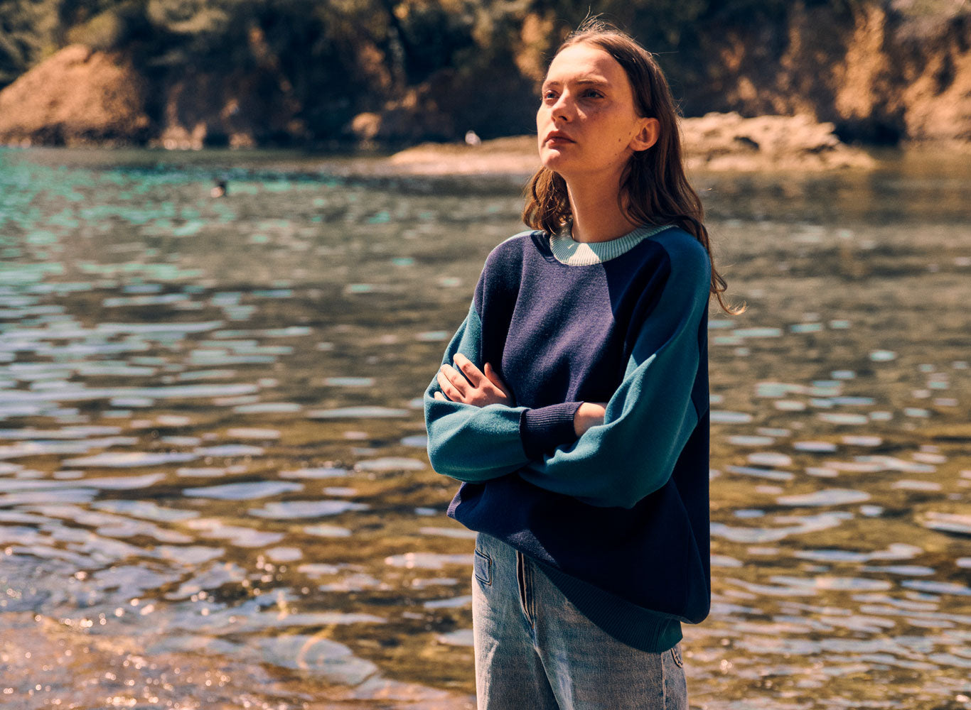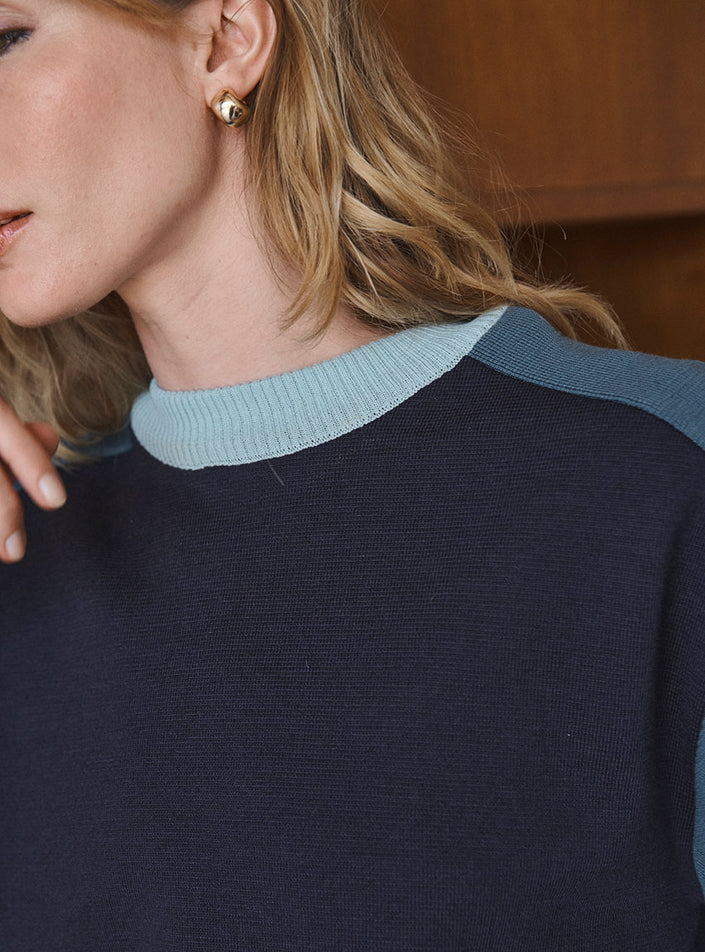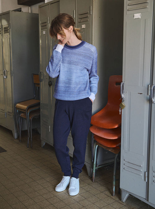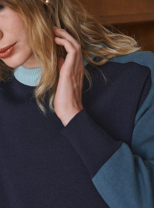 Le pull Aude en bleu marine est une pièce à l’allure moderne et structurée, sublimée par un jeu de couleurs audacieux. Tricoté en 100% laine fine mérinos, il offre une douceur incomparable et un confort absolu. Son design block color associe harmonieusement le bleu marine, vert bleuté et vert iceberg, créant un contraste subtil et raffiné. Sa coupe loose et ses emmanchures marteau lui confèrent un tombé fluide et une silhouette décontractée. La maille point de Rome, dense et texturée, garantit un maintien parfait et une tenue élégante au fil du temps. Finitions impeccables avec un col en côtes redoublées et un démarrage en bord-côte 2x2 sur le bas et les manches pour une structure subtile.