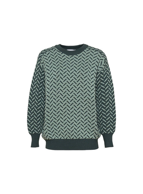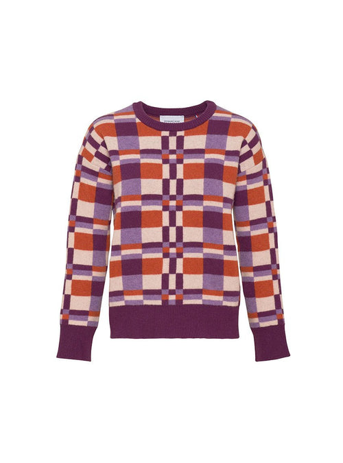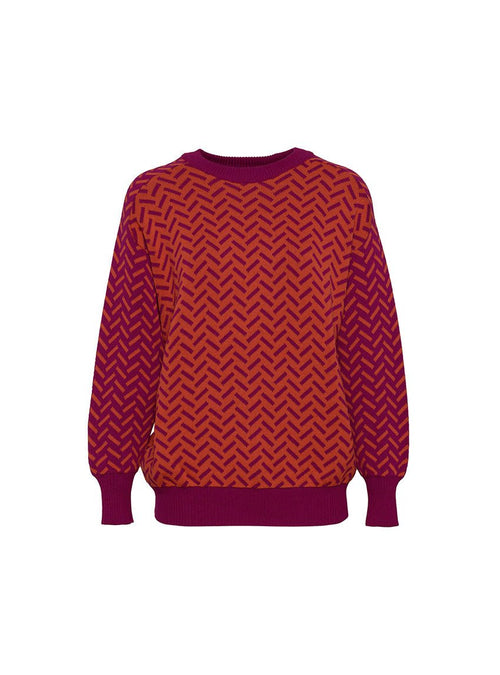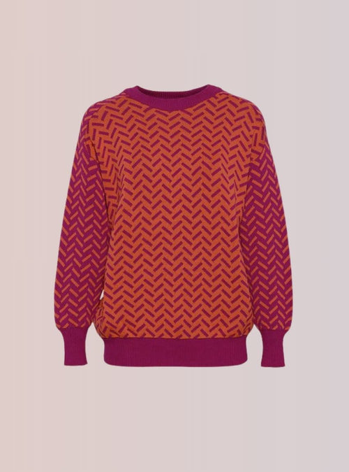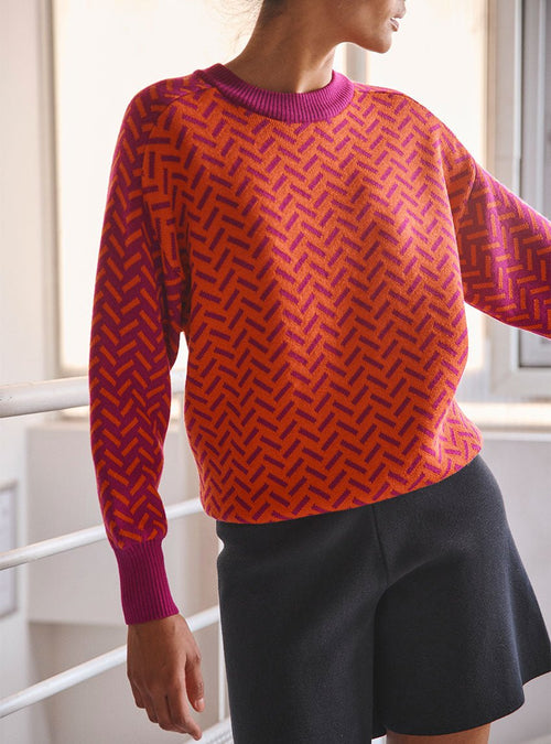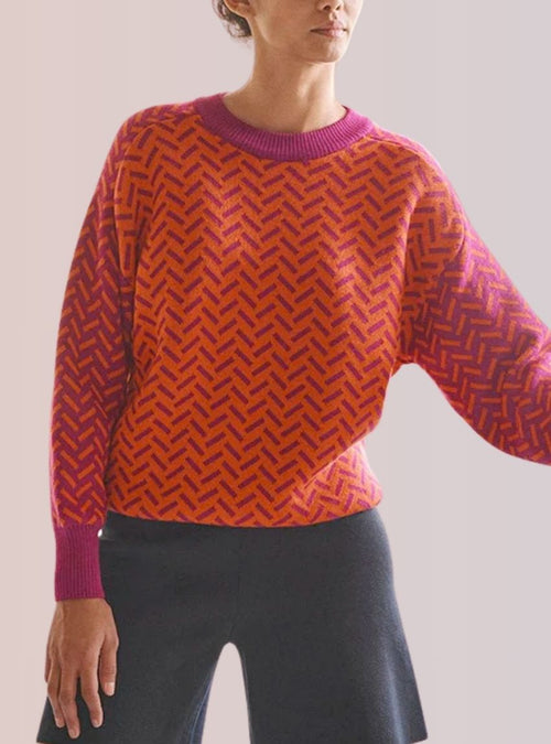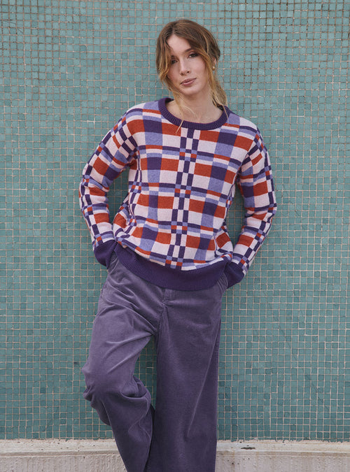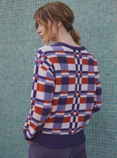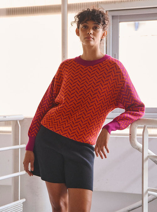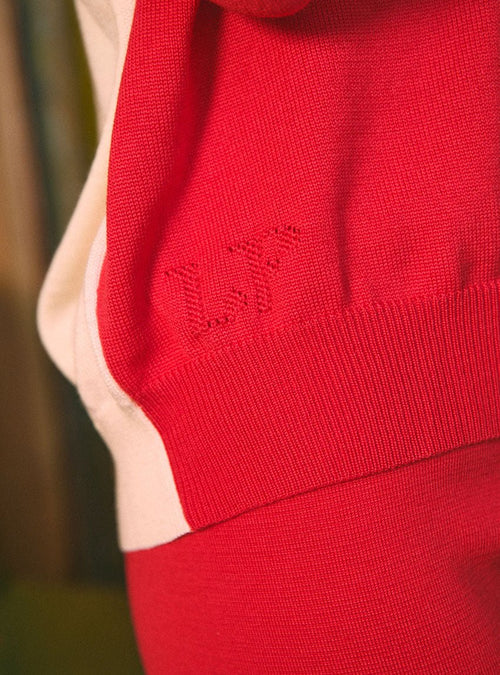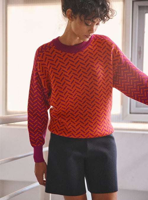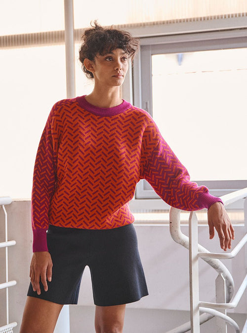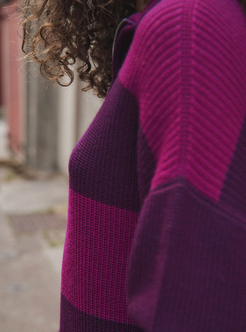 Ce pull joue avec une palette harmonieuse en block color pour un effet visuel moderne et audacieux.