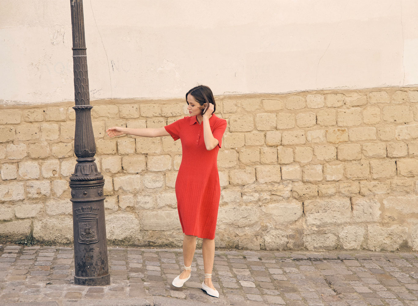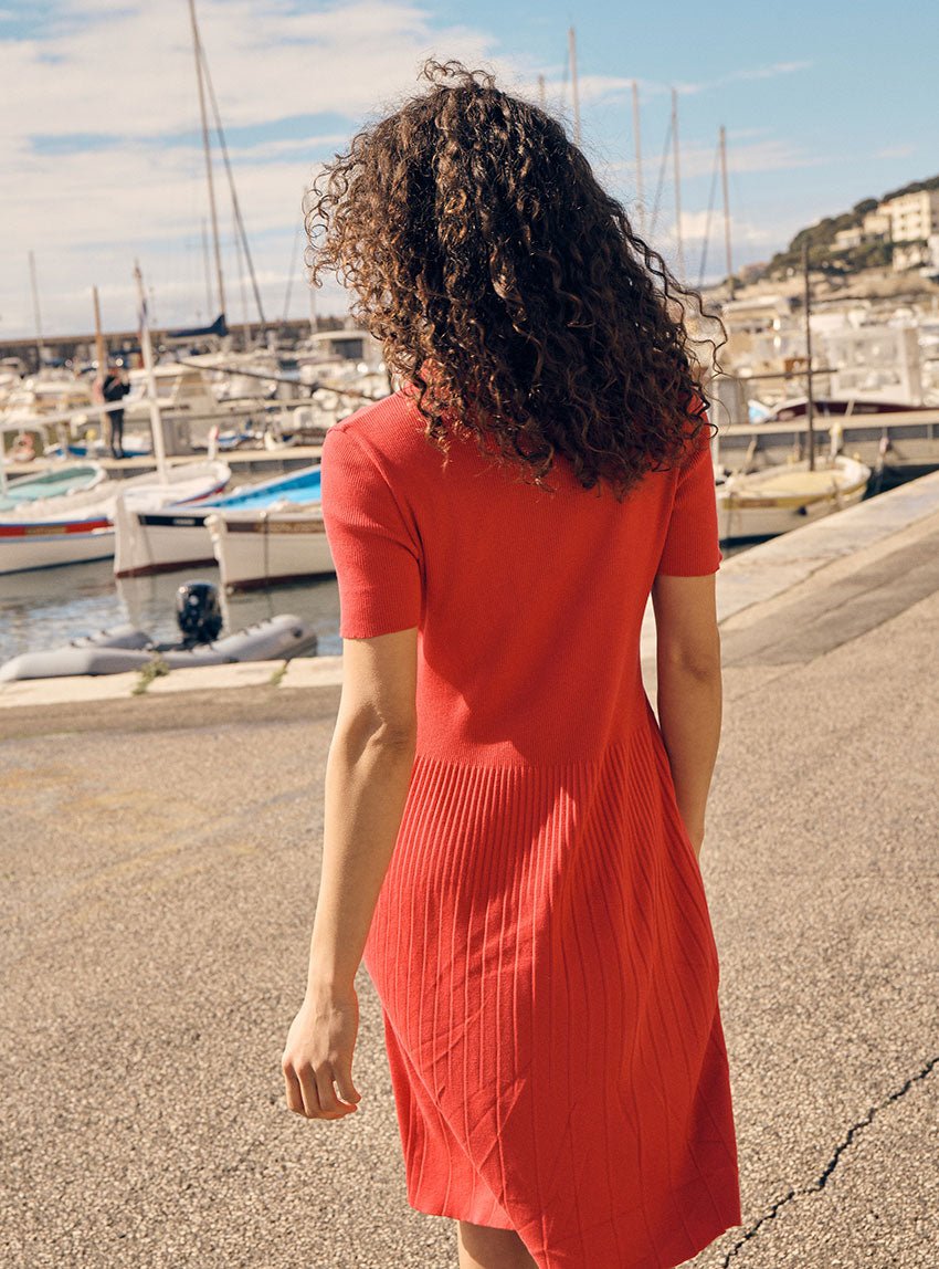 La robe Bess en rouge doux incarne une élégance décontractée, entre structure et souplesse. Tricotée en 100% coton, sa maille en côtes sculpte délicatement le buste avant de se détendre en un plissé subtil à partir de la taille, évoquant le mouvement naturel d’une robe polo revisitée. Les manches courtes et la patte de boutonnage classique ponctuent ce modèle d’un charme à la fois sportif et raffiné.