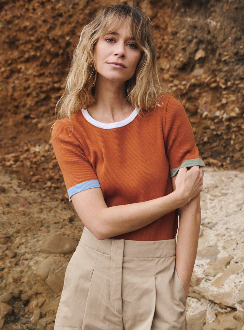 Avec son allure graphique et sa maille en côtes 2x2, le top Bastienne s’impose comme un essentiel revisité. Tricoté en coton 100%, il mêle confort et structure dans un tombé souple et affirmé. Son encolure ronde bordée de blanc contraste avec justesse, tandis que les rayures placées au démarrage des manches — bleu aster à droite, vert kaki à gauche — apportent une touche de fraîcheur et de caractère. La teinte marron terre de sienne qui habille l’ensemble évoque la chaleur du sol, la matière brute, une intensité organique qui ancre la silhouette dans une palette profonde et naturelle. C’est une couleur forte, presque minérale, que les détails colorés viennent réveiller avec un twist contemporain et lumineux.