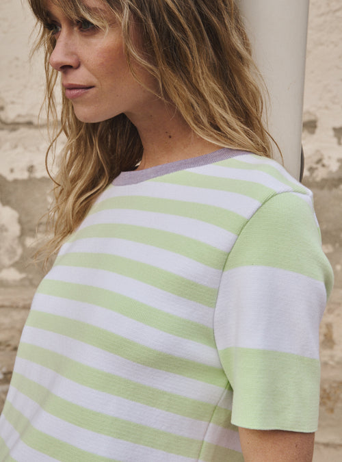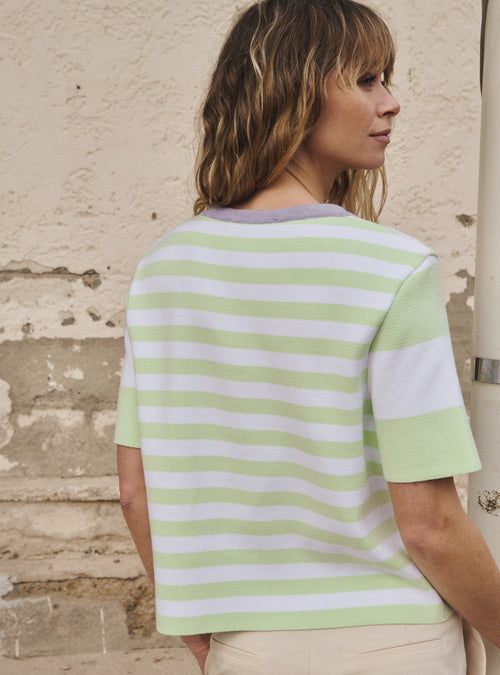 Avec sa coupe affirmée et sa maille texturée en côtes 2x2, le top Bastienne se joue des contrastes pour composer une silhouette à la fois audacieuse et rafraîchissante. Tricoté en coton, il allie structure et souplesse, offrant un porté aussi net que confortable. L’encolure ronde bordée de rose pastèque trace une ligne graphique, tandis que les manches courtes, dynamisées par des rayures contrastées—blanc éclatant à droite, jaune luciole à gauche—introduisent une asymétrie subtile mais vibrante. Le violet lavande, coloris principal, imprime sa douceur florale et veloutée à l’ensemble, comme un souffle printanier délicatement sucré. Associé à ces accents lumineux, il révèle une palette pleine de fraîcheur et de personnalité, pour une pièce qui s’exprime autant par ses teintes que par son esprit libre.