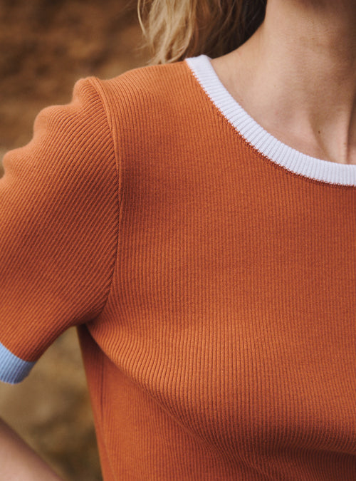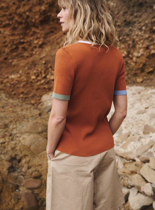 Le top Bénédicte est tricoté en jersey fin 100 % coton, une maille légère et respirante qui épouse le corps avec souplesse. Ce tricot fin apporte un tombé fluide et une sensation de fraîcheur idéale pour les beaux jours. Le jeu de côtes 2x1, présent en bordures, structure subtilement la silhouette et affirme une finition nette, précise, à la fois sobre et graphique. Cette maille estivale, à la fois technique et délicate, combine confort, douceur et une grande finesse visuelle.