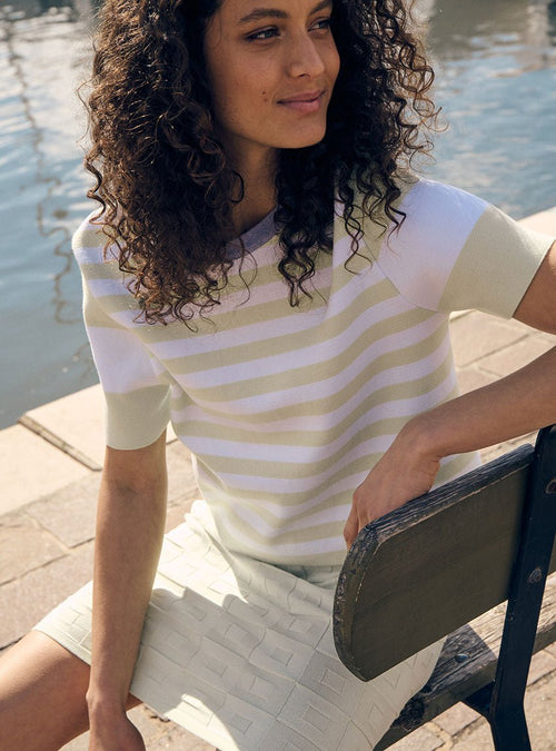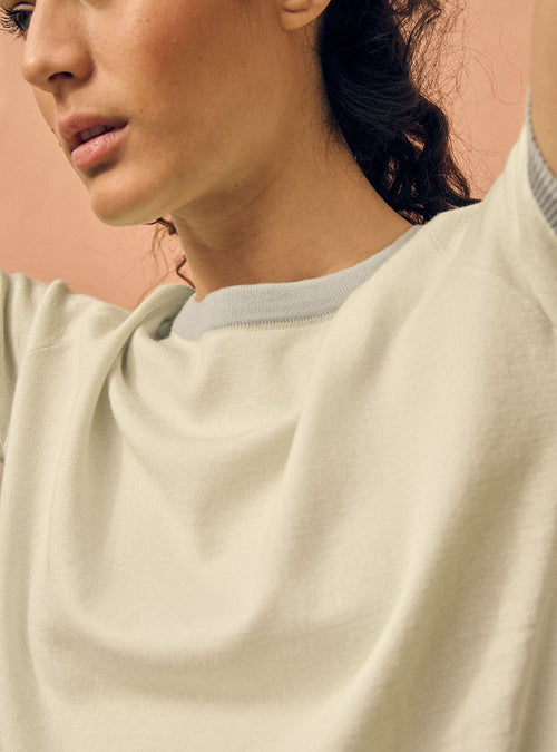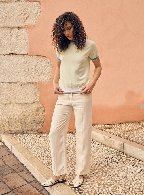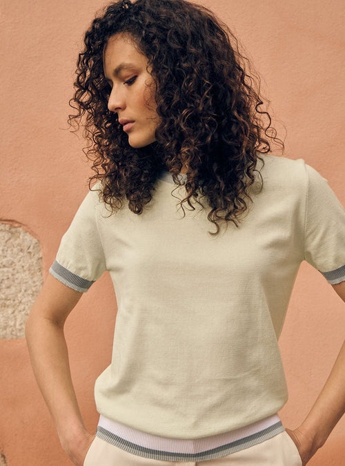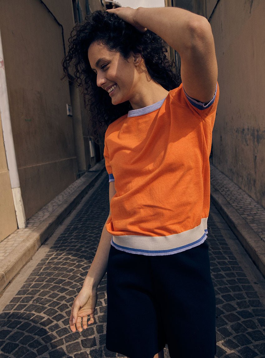 Côté palette, le top Bianca ose une composition solaire et subtilement orchestrée. Le corps se pare d’un orange éclatant, vif comme un fruit d’été mûr, énergisant sans être excessif. Les bords côtes viennent en contrepoint : un col violet lavande en tubulaire, doux et inattendu, des rayures bicolores aux manches (violet lavande et bleu brume) et un trio chromatique sur la base du top, mêlant violet lavande, bleu brume et beige argile. Une partition colorée, pensée comme un jeu graphique, qui conjugue chaleur, fraîcheur et singularité.