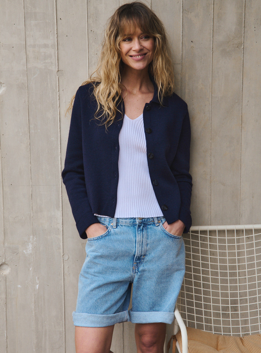 La veste Armelle en bleu marine est une pièce courte et élégante qui apporte immédiatement une allure chic et structurée à la silhouette. Avec son col polo ouvert et sa patte de boutonnage à même, repliée et piquée, elle revisite les codes du vestiaire féminin avec sobriété et modernité. Ses emmanchures montées soulignent une coupe nette, idéale pour un porté aussi bien décontracté que plus habillé. Confectionnée en 100% laine mérinos, elle se distingue par sa maille Point de Rome, une maille dense et raffinée qui offre une tenue impeccable tout en restant douce et confortable. Cette construction particulière apporte du relief, de la structure et une sensation enveloppante parfaite pour la mi-saison ou les journées plus fraîches. Déclinée dans un bleu marine profond et intemporel, la veste Armelle s’associe facilement à un jean brut pour un look casual chic, à un pantalon écru pour une silhouette lumineuse ou encore à une jupe droite pour une allure plus élégante. C’est une pièce versatile, facile à porter au quotidien, qui traverse les saisons avec style et distinction.